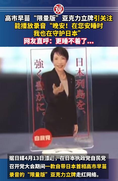 真的要被日本首相的操作整懵了!为了刷好感、拉支持,高市早苗居然整出个让人跌破眼镜的活儿,全网网友看完直接笑疯,吐槽声都快把屏幕炸穿了! 事情就发生在4月12号到13号,东京自民党召开党大会期间,一款印着高市早苗模样的限量亚克力立牌突然爆火,但它能火,跟颜值半毛钱关系没有,全靠一个离谱的设计——这玩意儿居然自带语音功能! 只要轻轻按一下,就能听到高市早苗的声音,一遍遍地说“晚安!在您安睡时,我也在守护日本”。本来是想走温情路线,博一波民众好感,没成想,直接把自己玩翻车了。 网友们的吐槽堪称大型“扎心现场”,清一色都是又好笑又实在:“别守护我了行不行,听完我彻底睡不着了”“本来都困得睁不开眼,一听到这声音,瞬间精神抖擞,膈应得睡不着觉”。说白了,这哪里是什么晚安问候,分明就是妥妥的“失眠神器”! 其实网友们吐槽得一点都没错,也一点都不冤枉她,就在这款语音立牌推出的同一时间,高市早苗在自民党大会上大言不惭地宣称,“修宪的时机已经到了”,还放话明年要继续推进修宪相关事宜。 这段时间,她就没停下折腾的脚步,一会儿要增加防卫费用,一会儿又琢磨着修改和平宪法,本来日本老百姓心里就慌慌的,没个安全感,她倒好,还整这么个语音立牌装温柔、装关怀,也太假了,谁看了不膈应? 说实话,这所谓的语音立牌,根本不是什么对民众的关怀,就是一场尴尬到能抠出三室一厅的政治作秀。 老百姓想要的,从来都不是睡前一句虚情假意的客套话,而是安安稳稳、踏踏实实的日子,不是整天被战争的阴影笼罩,提心吊胆地过日子。 高市早苗与其花心思搞这些花里胡哨、没用的噱头,不如静下心来,好好想想怎么让老百姓过上衣食无忧、安心踏实的日子。 说到底,这场闹剧,不过是自民党想美化自身形象的小伎俩,结果偷鸡不成蚀把米,反倒被网友骂上热搜,说到底,都是自找的! 信息来源:观察者网《高市早苗“限量版”亚克力立牌引关注,能播放录音“晚安!在您安睡时我也在守护日本”,网友直呼:更睡不着了...》2026-04-14