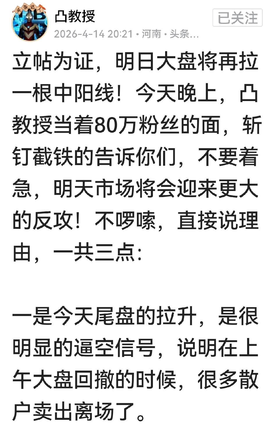 凸教授立帖为证,明天大A将再度拉出大阳,上演逼空行情。 注意,他这话可是在美股开盘之前和油价跳水之前1个半小时说的,现在油价直线跌到92,美国三大股指近期都有望将战事挖的坑填平,至少,外围形势有望给他的预测作出支撑。我今天也支持他,立帖为证。 当然,我一般看创业板,他长期盯上证;我专注科技股,他做券商+科技,算不上一路人,还是各看各的个股行情。