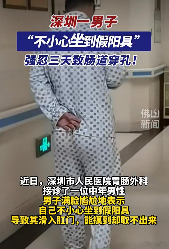 深圳一位中年男子到医院说自己“不小心把玩具坐了进去”事情导致他肠道穿孔,医生只能为其手术,把异物成功取出但男子还是得接受肠道造口手术,等3个月到半年再做手术才能恢复又是一个阴阳人烂屁股
