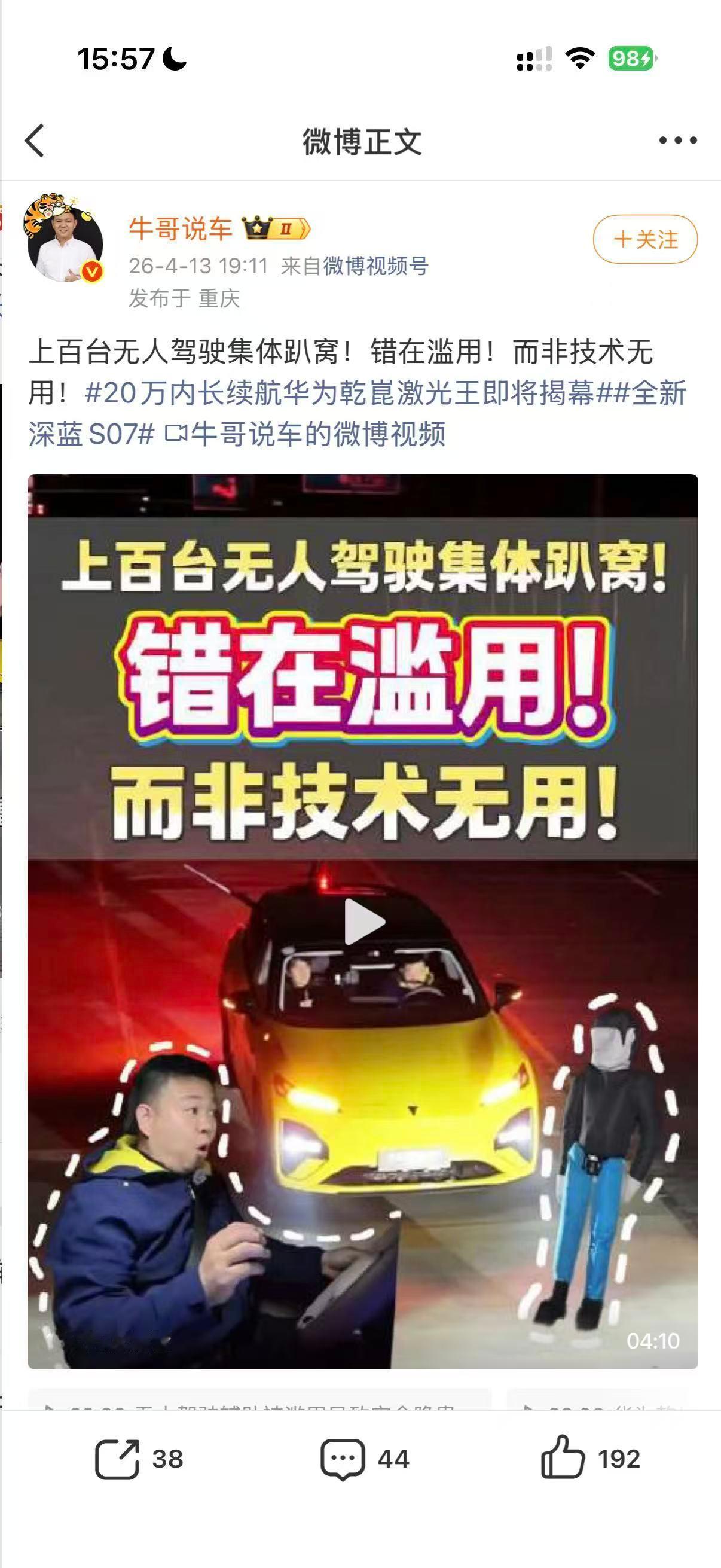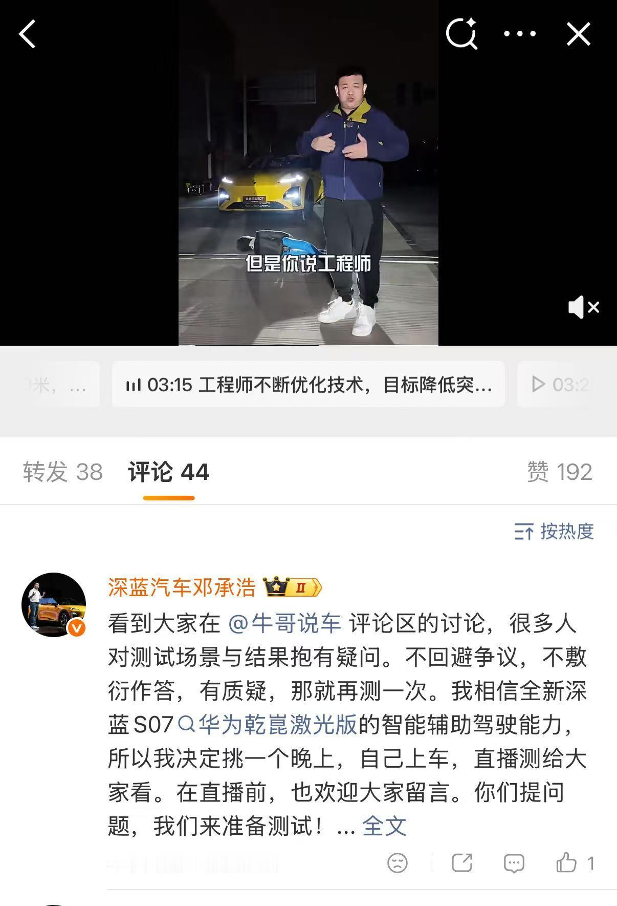 邓承浩回复博主智驾测试质疑网友质疑博主智驾测评结果智驾测评的争议,从来都不是技术本身没用,而是测试有没有贴近真实用车。网友对对于深蓝S07的测评提出疑问,觉得缺少重庆山城的连续急弯等复杂工况,对于网友的质疑,邓承浩直接接下所有质疑:不回避争议,有质疑就再测一次,亲自上车夜间直播,把智驾的每一步都摊开给大家看。深蓝 S07 搭载的华为乾崑激光,在极限测试里已经展现了超强感知,这场直播就是对真实实力的最终验证,别错过!!
