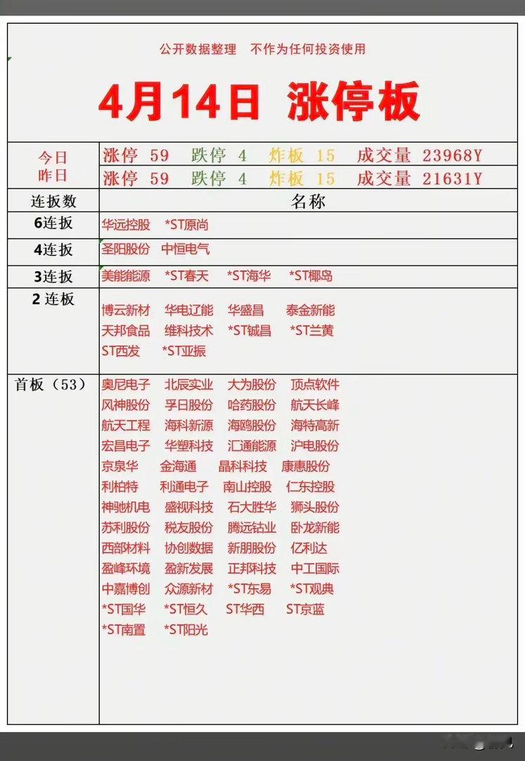 4月14日涨停板梯队梳理分析今日A股涨停家数与昨日持平,均为59家,跌停4家、炸板15家,成交量较昨日放大,市场情绪维持平稳。连板梯队呈现分化特征:高位连板延续性有限,6连板仅2家,4连板2家;中低位连板标的中ST股占比偏高,3连板、2连板标的多为ST股;首板标的分布广泛,覆盖AI算力、新能源、周期、地产等多个赛道,资金在高位情绪标的与低位题材间轮动明显。涨停个股梳理分析1. 华远控股(6连板):当前市场最高连板标的,连续涨停带动短线情绪,成为资金抱团的核心风向标,高位连板延续性较强。2. *ST原尚(6连板):ST板块中连板高度领先标的,受益于ST股情绪回暖,连续涨停,资金抱团参与特征明显。3. 圣阳股份(4连板):液冷储能+IDC电源双赛道标的,契合AI数据中心散热需求,连续涨停,市场关注度持续走高。4. 中恒电气(4连板):获宁王增资合作催化,算力协同业务推进,叠加电力设备属性,连续涨停,资金承接力度强。5. 美能能源(3连板):能源赛道标的,受益于油气相关业务催化,连续涨停,在能源板块中表现突出,市场热度较高。6. *ST春天(3连板):ST板块标的,受益于ST股情绪回暖,连续涨停,资金抱团参与,短线走势维持强势。7. *ST海华(3连板):ST板块标的,在ST股整体热度带动下,连续涨停,资金持续流入,短线关注度持续提升。8. *ST椰岛(3连板):ST板块标的,受益于ST股情绪催化,连续涨停,资金抱团明显,走势维持强势。9. 博云新材(2连板):一季报业绩大增,叠加航空航天业务布局,连续涨停,获资金持续关注,市场热度较高。10. 华电辽能(2连板):绿电赛道标的,受益于新能源电力建设催化,连续涨停,在电力板块中表现突出。11. 华盛昌(2连板):光模块扩产带动设备需求,作为上游设备供应商,连续涨停,AI通信产业链热度加持。12. 泰金新能(2连板):新能源赛道标的,受益于锂电相关业务催化,连续涨停,市场关注度持续提升。13. 天邦食品(2连板):食品养殖赛道标的,受益于行业景气度变化,连续涨停,资金持续流入,走势较强。14. 维科技术(2连板):钠电储能赛道标的,受益于钠电池技术发展,连续涨停,新型储能方向获资金追捧。15. *ST铖昌(2连板):ST板块标的,受益于ST股情绪回暖,连续涨停,资金抱团参与,短线热度较高。16. *ST兰黄(2连板):ST板块标的,在ST股整体热度带动下,连续涨停,资金持续流入,走势维持强势。17. ST西发(2连板):ST板块标的,受益于ST股情绪催化,连续涨停,资金抱团明显,短线关注度提升。18. *ST亚振(2连板):ST板块标的,受益于ST股情绪回暖,连续涨停,资金持续流入,走势维持强势。19. 奥尼电子(首板):AI终端相关标的,受益于消费电子与AI硬件需求,当日首板涨停,获市场资金关注。20. 北辰实业(首板):地产相关标的,受益于地产板块情绪催化,当日首板涨停,市场关注度有所提升。21. 大为股份(首板):存储芯片赛道标的,受益于行业涨价催化,当日首板涨停,半导体方向获资金青睐。22. 顶点软件(首板):金融IT赛道标的,受益于金融科技热度,当日首板涨停,市场资金关注度持续提升。23. 风神股份(首板):轮胎制造标的,受益于周期行业催化,当日首板涨停,获市场资金关注。24. 孚日股份(首板):锂电VC添加剂相关标的,受益于锂电材料赛道,当日首板涨停,新能源方向获资金追捧。25. 哈药股份(首板):医药板块标的,受益于医药行业催化,当日首板涨停,市场关注度有所提升。总结整体来看,今日A股涨停梯队热度平稳,涨停家数维持高位,成交量放大反映市场交投活跃。连板梯队呈现“高位主线标的+ST股抱团”的特征,高位连板延续性有限,中低位ST股成为资金抱团的重要方向;首板标的则分布于多个赛道,体现出资金既抱团高位情绪标的,也在低位题材中寻找轮动机会的偏好,市场结构性行情特征显著。本文涉及资讯内容来自网络公共信息,仅供参考不构成投资建议!