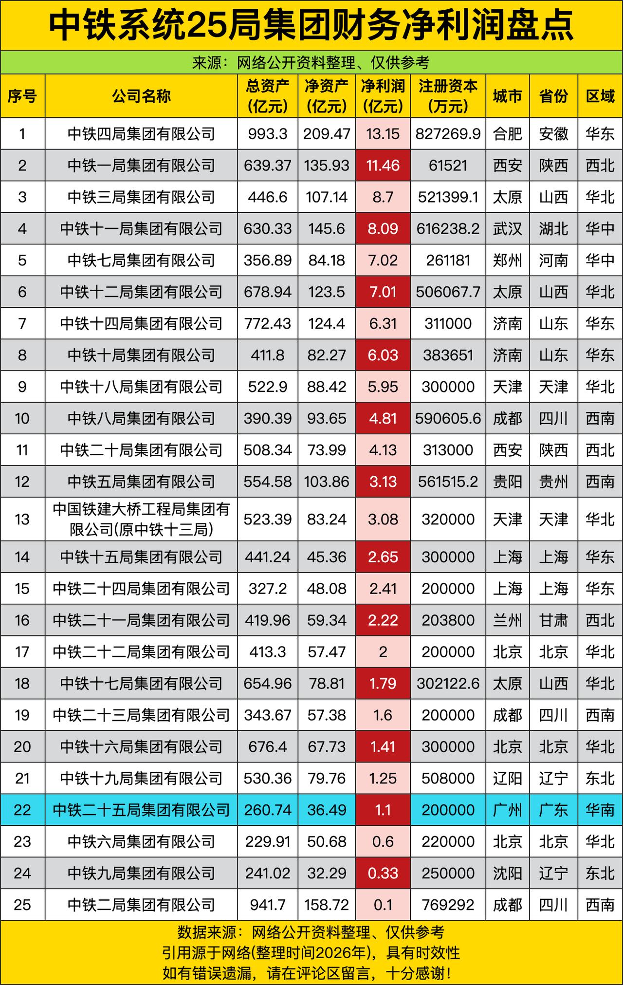 中铁四局直接杀疯了,13.15亿净利润像个“赚钱卷王”,中铁一局11.46亿紧随其后,中铁三局8.7亿也在疯狂输出,这哪是搞基建,简直是开了“工程印钞机”!中铁十一局、七局、十二局等也不甘示弱,仿佛在喊“我们的项目,能绕地球半圈”,华东、西北、华北、华中、西南、东北、华南地区更是成了“赚钱主力军”,中铁四局、一局、三局、十一局、七局、十二局等公司扎堆上榜,像一群“基建特种兵”。 从区域看,华东地区的中铁四局、十四局、十局、八局、十五局、二十四局、六局、二局等,净利润从13.15亿到0.6亿不等,像“华东基建豪华舰队”;西北地区的中铁一局、二十局、二十一局、九局等,净利润从11.46亿到0.33亿,像“西北基建轻骑兵”;华北地区的中铁三局、十二局、十八局、二十二局、十七局、十六局、六局、九局等,净利润从8.7亿到0.33亿,像“华北基建三剑客”;华中地区的中铁十一局、七局等,净利润从8.09亿到7.02亿,像“华中基建游击队”;西南地区的中铁八局、五局、二十三局、二局等,净利润从4.81亿到0.1亿,像“西南基建神秘组”;东北地区的中铁十九局、九局等,净利润从1.25亿到0.33亿,像“东北基建探险队”;华南地区的中铁二十五局,净利润1.1亿,像“华南基建独行侠”。 这净利润的背后,是地区项目资源、企业实力和市场环境的共振。中铁四局在华东地区项目多、实力强,赚钱优势大,中铁一局在西北地区靠政策和技术提升利润,中铁三局在华北地区项目资源丰富,纷纷加入“赚钱大军”。基建赚钱就像“企业的发动机”,赚得多不仅能支撑企业发展,还能带动就业和地方经济,难怪各地都在“卷”基建,毕竟“工程也能下金蛋”。 未来,这场“基建内卷战”只会更狠,毕竟“基建强则国家强”。中铁四局会继续当“赚钱卷王”,中铁一局、三局会追赶,其他地区也会想办法提升净利润,说不定哪天连中铁二十五局这样的“基建弱势地区”都能靠新项目逆袭,毕竟“基建无边界,只要肯钻研”!这场基建的狂欢,注定要在中华大地上,一直热闹下去!