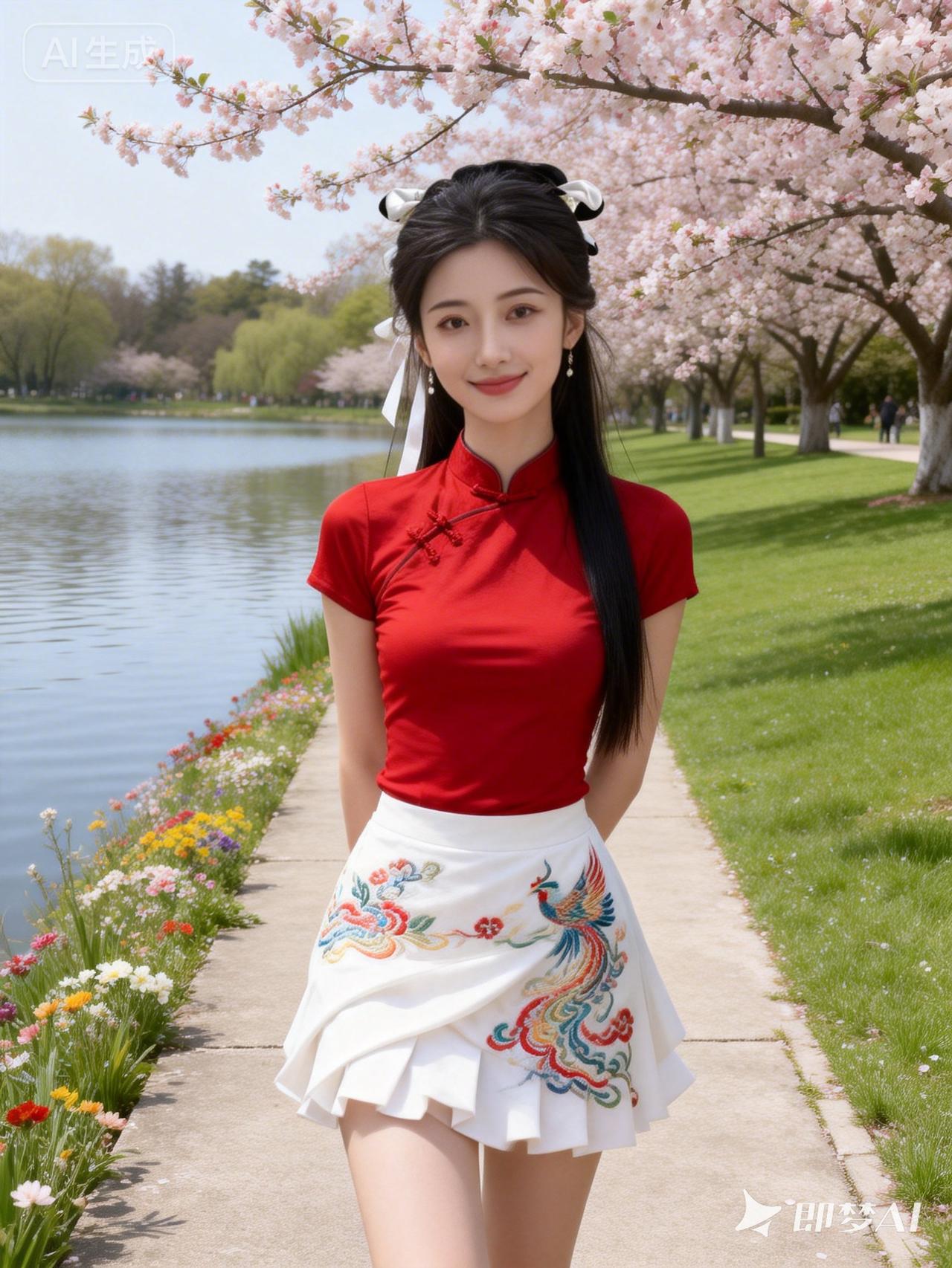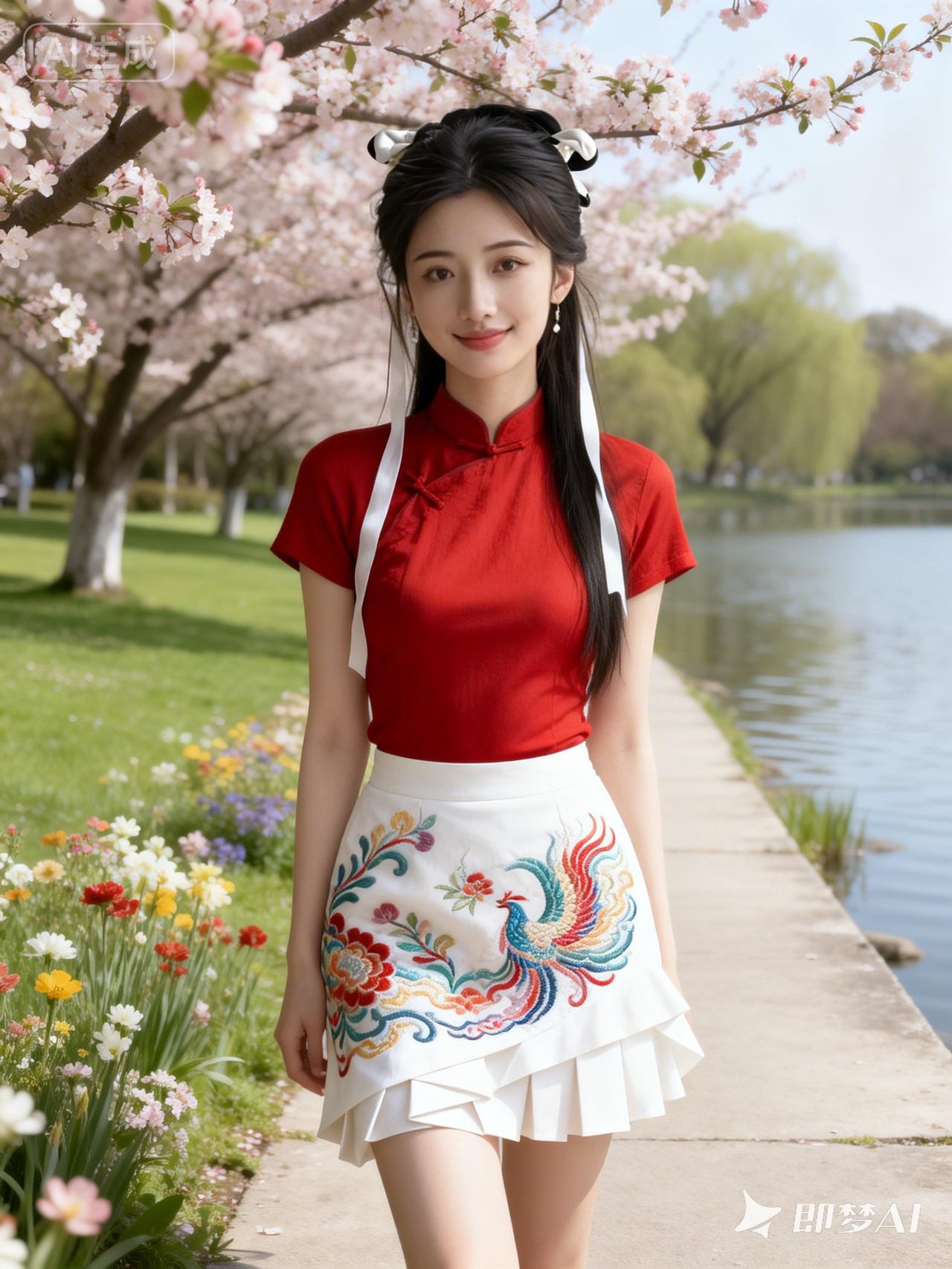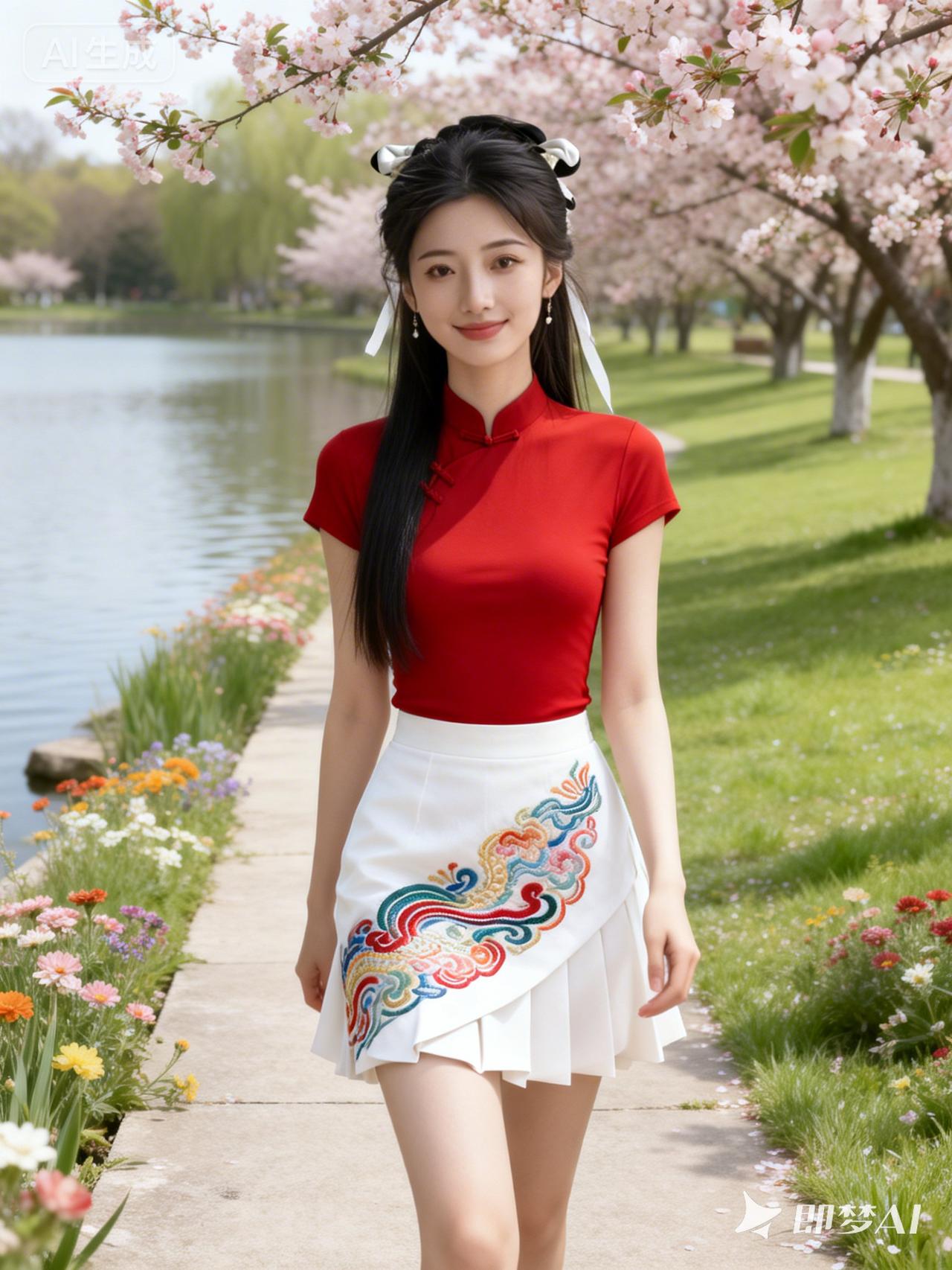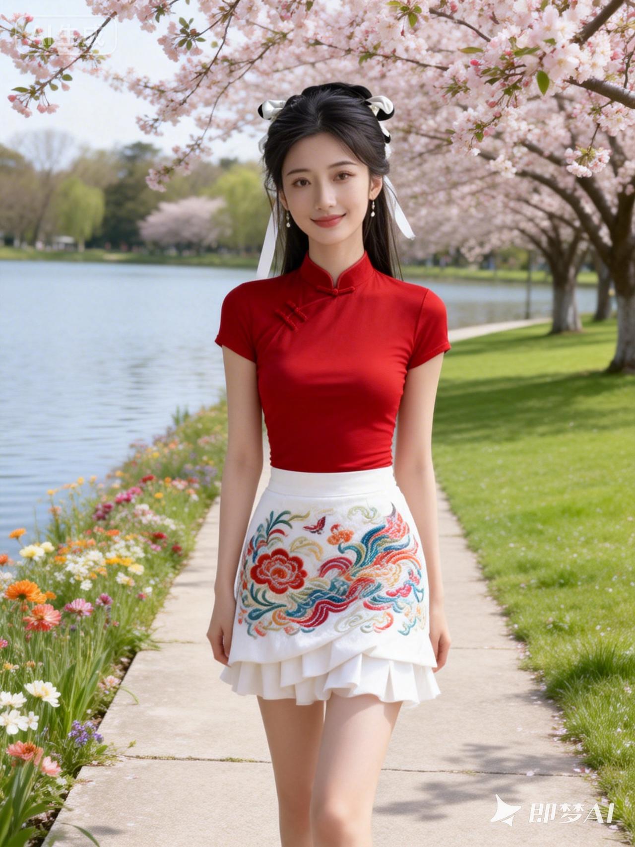 春日漫步,红裙与花海相映成趣