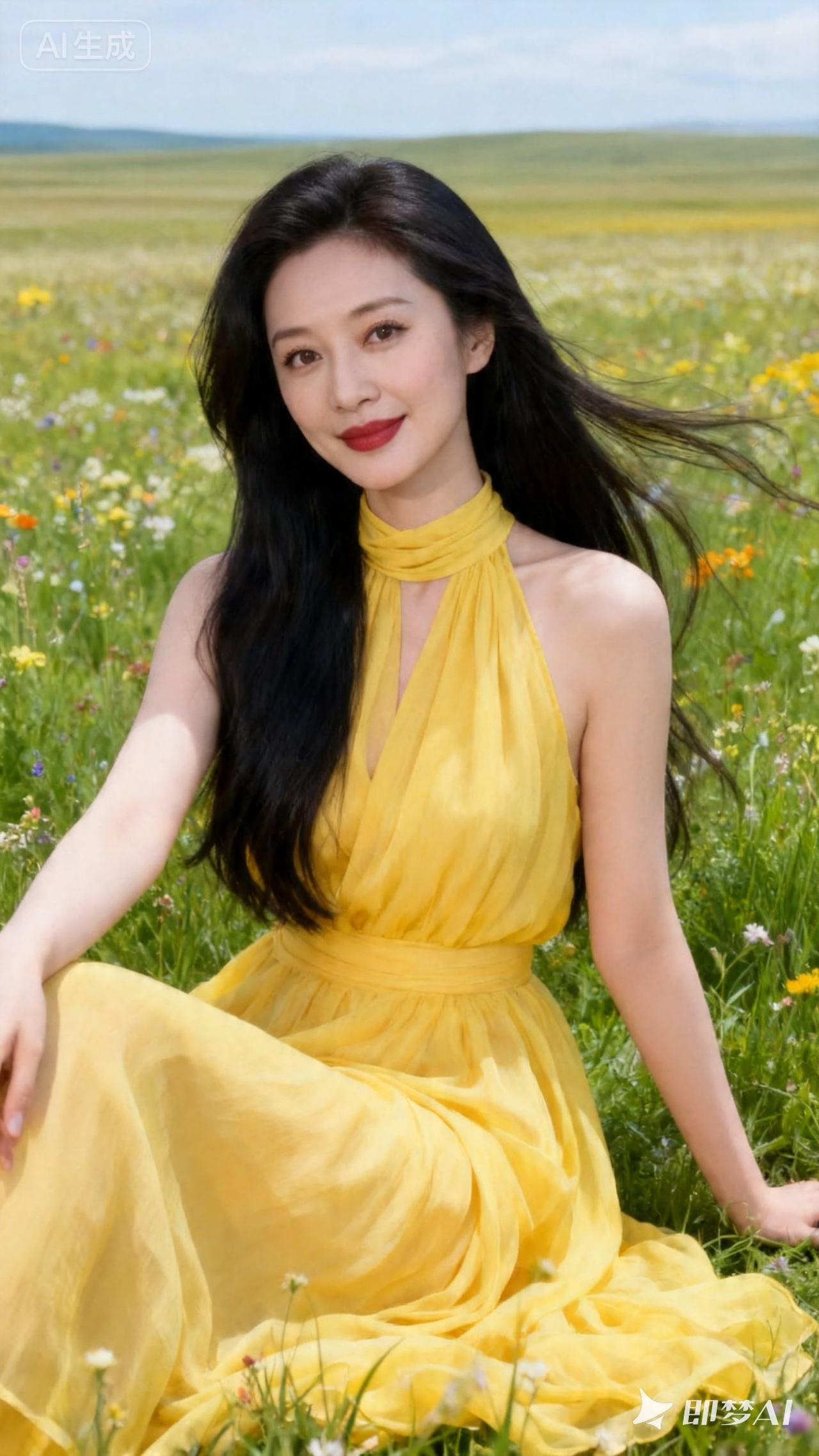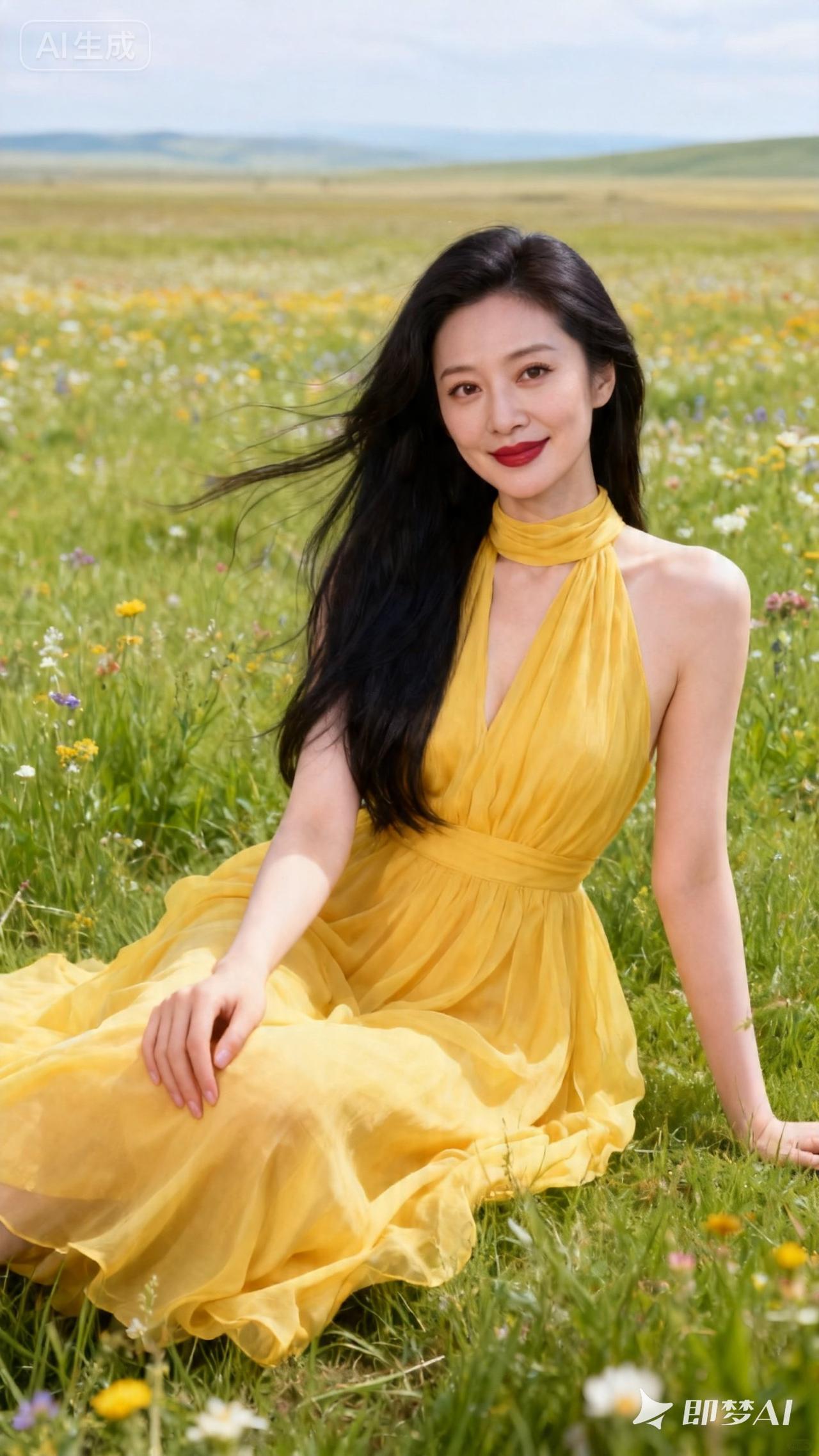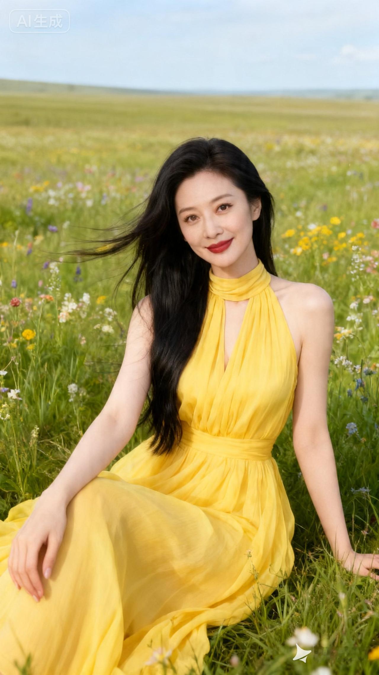 在花海中,穿黄色裙子的她,美得像一幅画