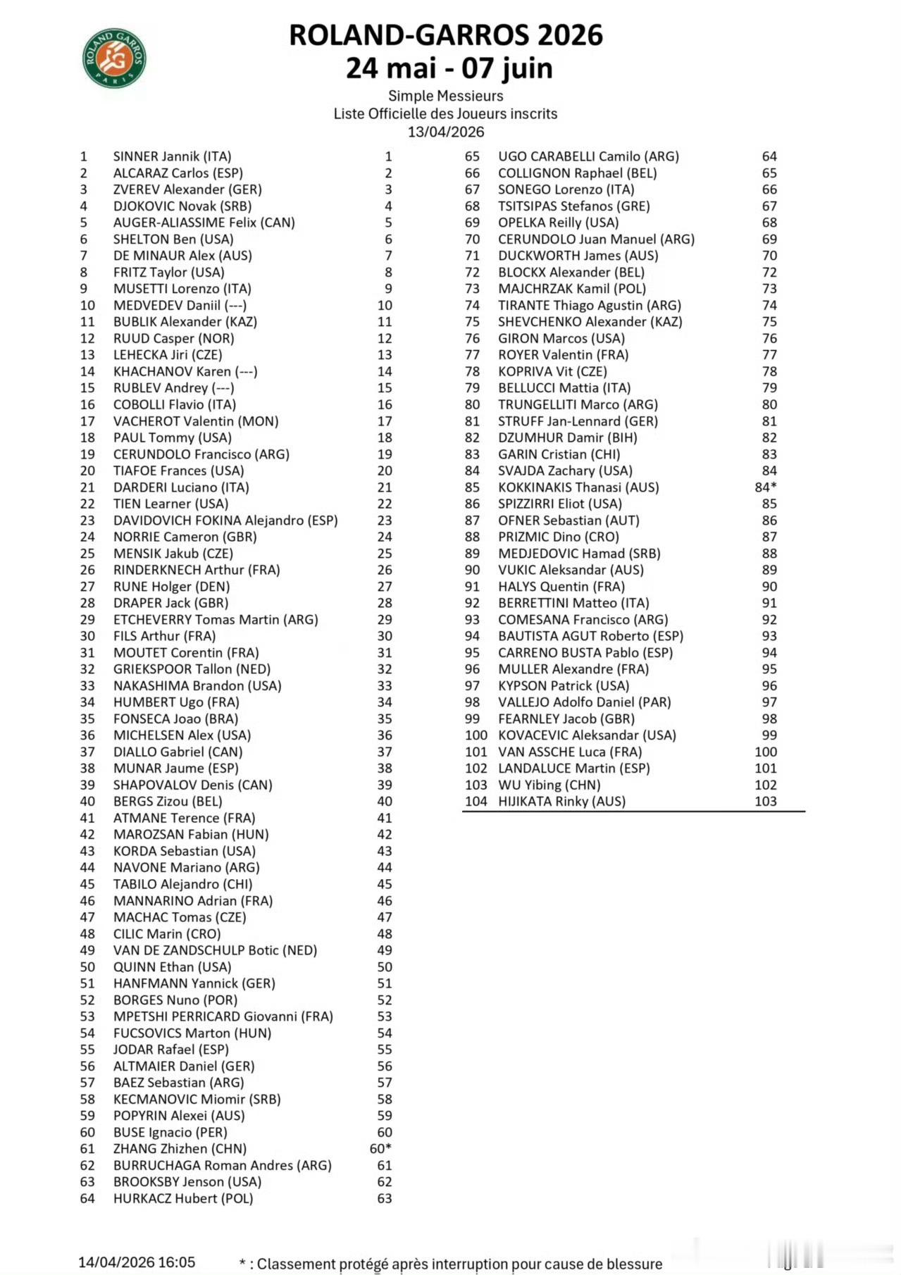 法网官方公布单打正赛名单,中国5人直接入围