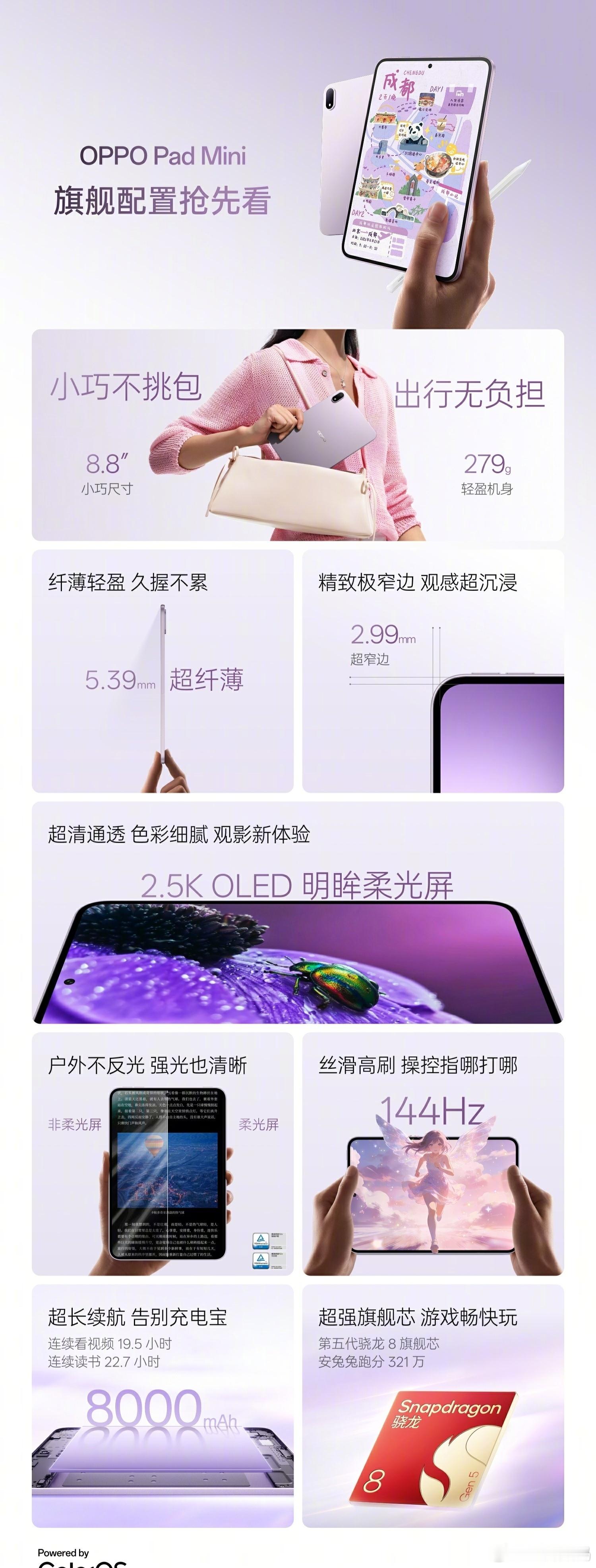 OPPO Pad Mini:第五代骁龙 8,安兔兔跑分 321 万;8000mAh 电池;8.8 英寸 2.5K OLED 明眸柔光屏,144Hz 刷新率;重量 279g,厚度 5.39mm,超窄边 2.99mm。