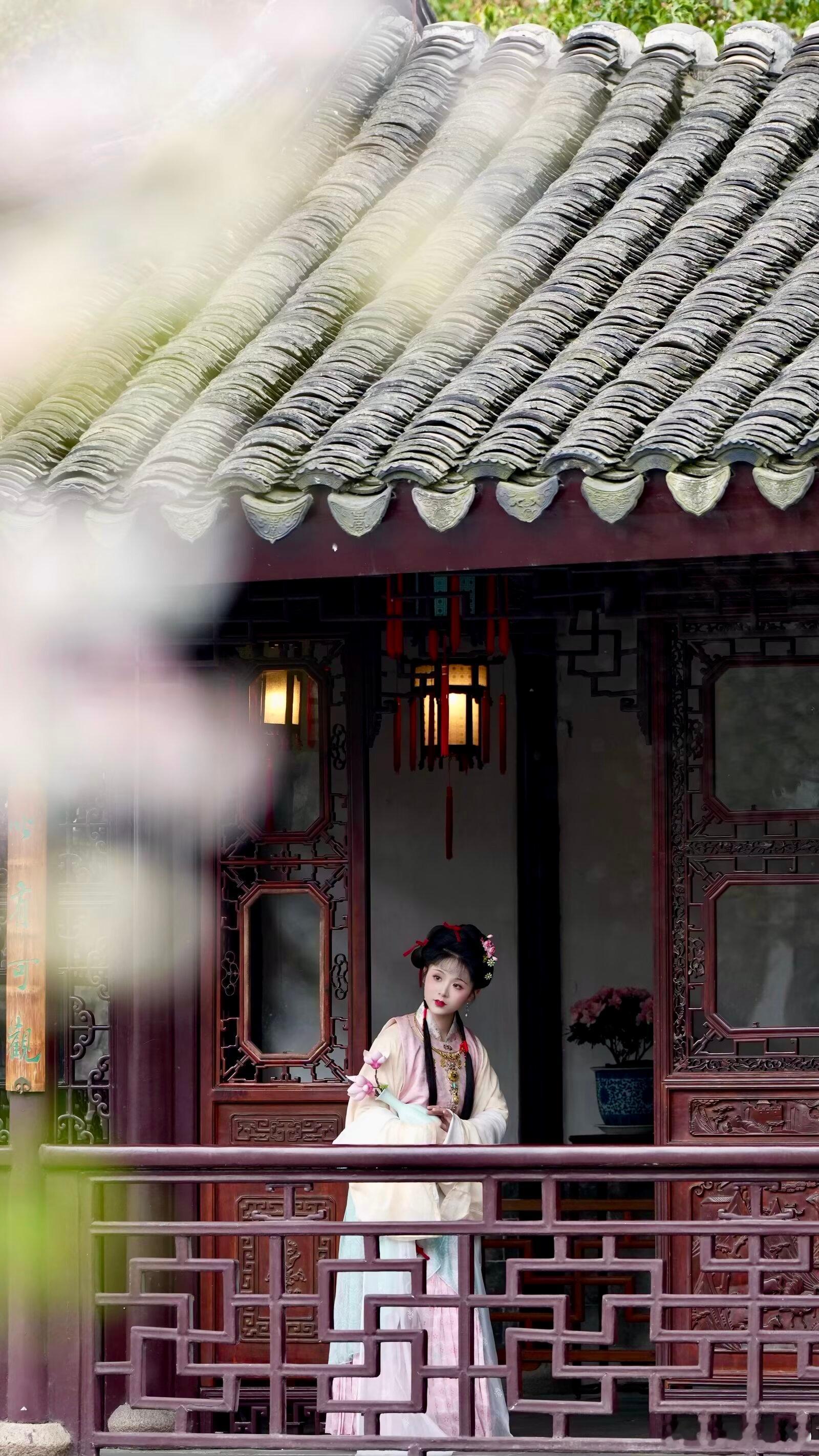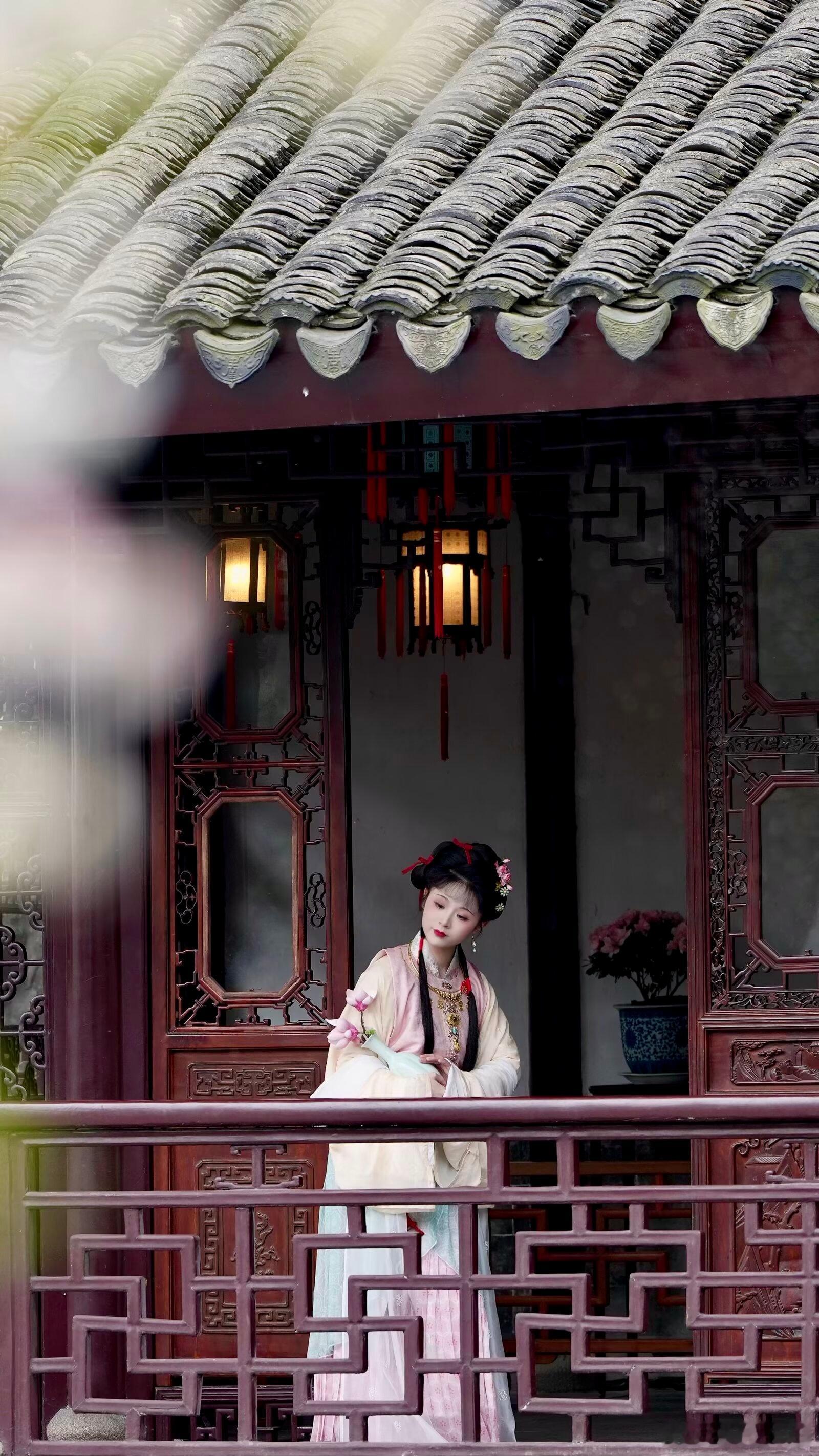 凭栏听风,执扇赏春。玉兰初绽,汉服映色,把春日的浪漫,都定格在这一瞬。苏州园林约