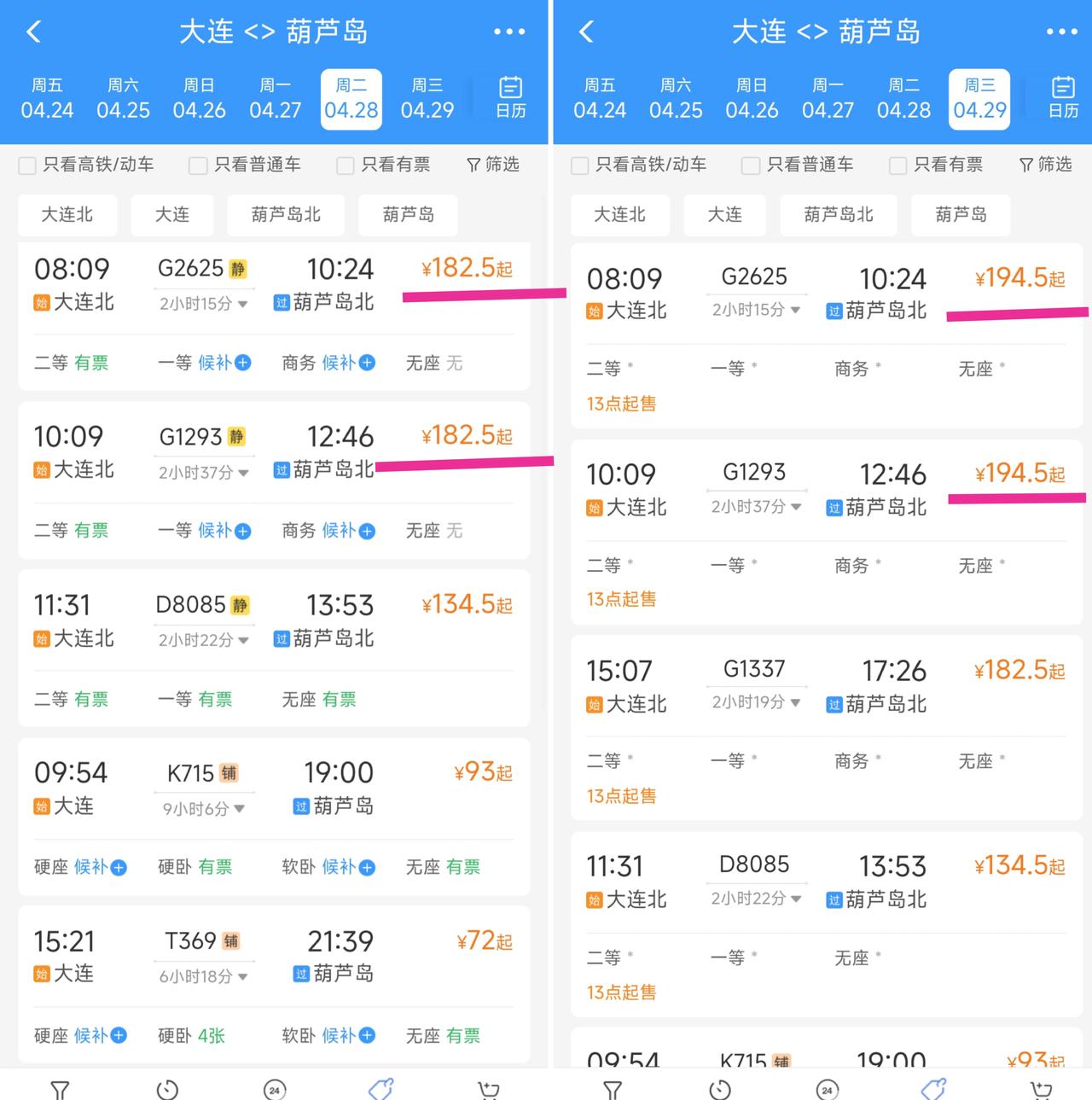 从4月29日起大连北到西安北的G1293次列车票价上涨,大连北到武汉的G2625次列车票价上涨。不过对于西安与武汉来说影响并不大,毕竟从大连到这些城市人们普遍还是选择飞机出行,真正郁闷的是葫芦岛。 本来大连到葫芦岛的高铁列车就不多。从4月29日起有2趟黄金时段的高铁列车票价从182.5元涨到194.5元,在高铁没有提速的情况下还需要多花12元钱,换做任何人心里都很失落,见此情景不禁感慨T131与T369这两趟绿皮车今后想要抢票更难了。