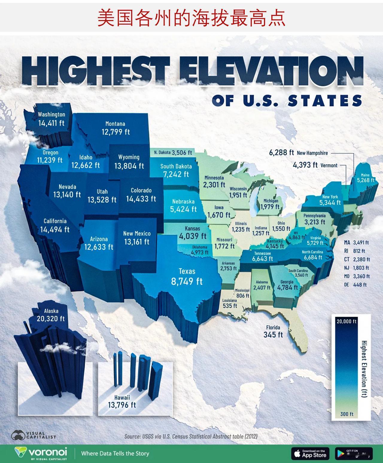 美国各州海拔差异十分悬殊:阿拉斯加州超20000英尺,而多个沿海州海不足1000英尺 从阿拉斯加州的迪纳利峰到佛罗里达州的布里顿山,美国各州最高点直观展现出全美海拔的巨大差异。 下面地图标注了各州的最高自然海拔点(单位:英尺,海拔高度),数据源自美国地质调查局(USGS),经美国人口普查局《统计摘要》整理发布。 ——阿拉斯加州海拔远超全美其他各州 阿拉斯加州在榜单中遥遥领先。其最高点迪纳利峰海拔20320英尺,比位列第二的加利福尼亚州惠特尼峰高出5826英尺。仅这一差值,就比美国东部许多州的整体海拔跨度还要大,足见阿拉斯加州地形之险峻。 这也意味着迪纳利峰的高度几乎是佛罗里达州最高点的59倍,凸显出美国海拔跨度的极端性。 一个清晰的地理规律显现:所有海拔超10000英尺的州均位于密西西比河以西。这些高峰集中分布在落基山脉、内华达山脉、喀斯喀特山脉等大型山系,而美国东部则以年代更久远、海拔更低的山脉为主。 俄勒冈州最高点海拔11239英尺,此后海拔急剧下降——比得克萨斯州低至2400多英尺,美国中部大部分地区海拔持续走低。 再往东,海拔逐渐过渡至阿巴拉契亚山脉及美国东部内陆区域。北卡罗来纳州、田纳西州、新罕布什尔州等州的最高点仍超6000英尺,但远低于落基山脉、喀斯喀特山脉、内华达山脉及阿拉斯加山脉的最高峰。 ——五个州最高点不足1000英尺 在海拔榜单的另一端,有五个州最高点从未达到1000英尺。 佛罗里达州排名垫底,仅345英尺——也就是说,阿拉斯加州最高点的高度几乎是它的59倍。这些低海拔地区集中在地势平坦的沿海地带,与多山的美国西部相比,海拔变化微乎其微。 这些州大多沿海且地势低洼,这也是其最高点远低于全美各州最高点中位数4588.5英尺的原因。 总体来看,全美有37个州海拔超2000英尺,22个州超5000英尺,即便西部高海拔区域占据主导,仍有大量国土拥有可观的海拔高度。