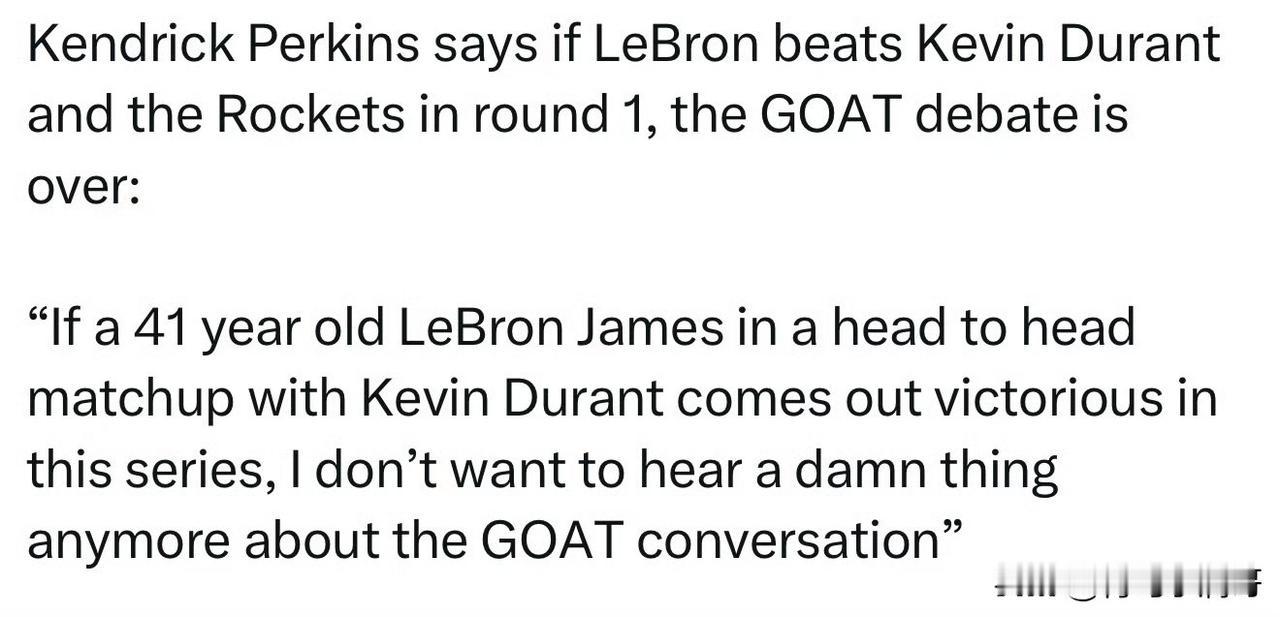 41岁詹姆斯的证明之战!!!詹姆斯vs杜兰特,谁首轮会出局? 近日,关于湖人和火箭这轮系列赛被炒的非常热,这两支关注度极高的球队就要真刀真枪的比赛了,那么谁能笑到最后呢? 对此,前NBA球员、现知名篮球评论员的大嘴帕金斯表示,西部四五名的对话,如果詹姆斯在首轮击败杜兰特和火箭,那么关于历史最佳球员的争论可以画上句号了。 帕金斯这是怎么了,感觉风评突然换方向了呢,不过他在评论界如今也是混的风生水起,当然无论他说什么都会以博眼球赚流量为主。 帕金斯说道,如果一位年龄已经高达41岁的勒布朗-詹姆斯在与37岁的凯文-杜兰特的正面对话中,还能够带领球队赢下这轮系列赛,那么就没有什么可说的了,关于GOAT的讨论,我再也不想听任何废话了。 湖人和火箭的系列赛将于4月19日上午八点半在湖人主场正式打响,真的是万众期待啊!詹姆斯 杜兰特 湖人