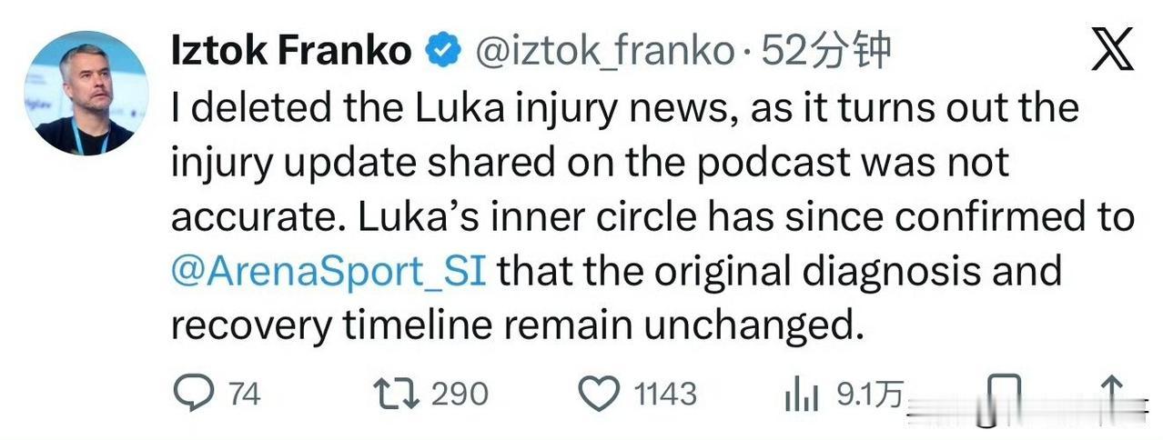澄清了!!!东契奇伤病诊断无误,恢复时间保持不变! 在早些时候,源自斯洛文尼亚记者透露了关于东契奇在西班牙腿筋拉伤的伤病诊断比最初在漂亮国诊断的要更加严重。 这话题一出,立刻就传遍了篮球界,这让湖人球迷更加失望了,而且也让本就不被看好的湖人被外界更加看衰。 但是随后,该记者更新了自己的社媒并表示:我删除了关于卢卡-东契奇受伤的消息,因为在播客上分享的伤情更新并不准确。从东契奇的内部消息人士证实,最初的诊断和恢复时间表保持不变。 看来这消息真的太恐怖了,好在最终澄清了,不过任何情况下都是健康第一,祝东契奇早日康复。湖人 东契奇