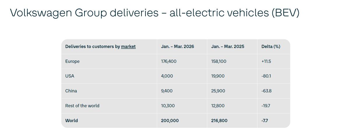 大众集团刚刚发布了2026Q1电动车数据。 大众集团2026年第一季度全球纯电动车销量约20万辆,同比下降7.7% 从区域结构来看,差异非常明显: 欧洲:17.6万辆,同比增长约11.5% 中国:9,400辆,同比下降约63.8% 美国:4,000辆,同比下降约80.1% 其他市场:约1万辆,同比下降19.7% 看来大众在中国是卷到怀疑人生,在美国是被特斯拉按在地上摩擦。
