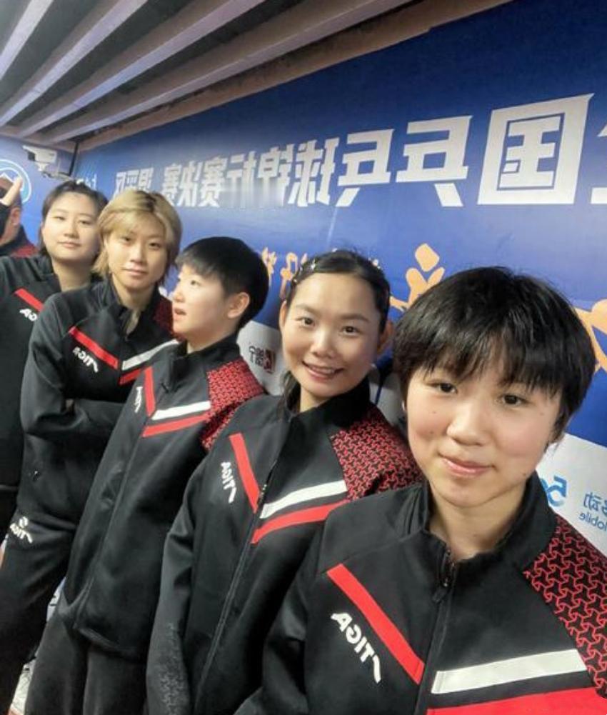 五位身着斯蒂卡队服的女乒球员合照:我认出了笑意粲然的何卓佳,俏皮可爱的孙颖莎,浅淡春山的臧小桐,左二那位双臂交叉在胸前的金发女子是老将白杨吗?