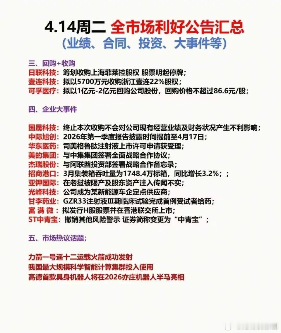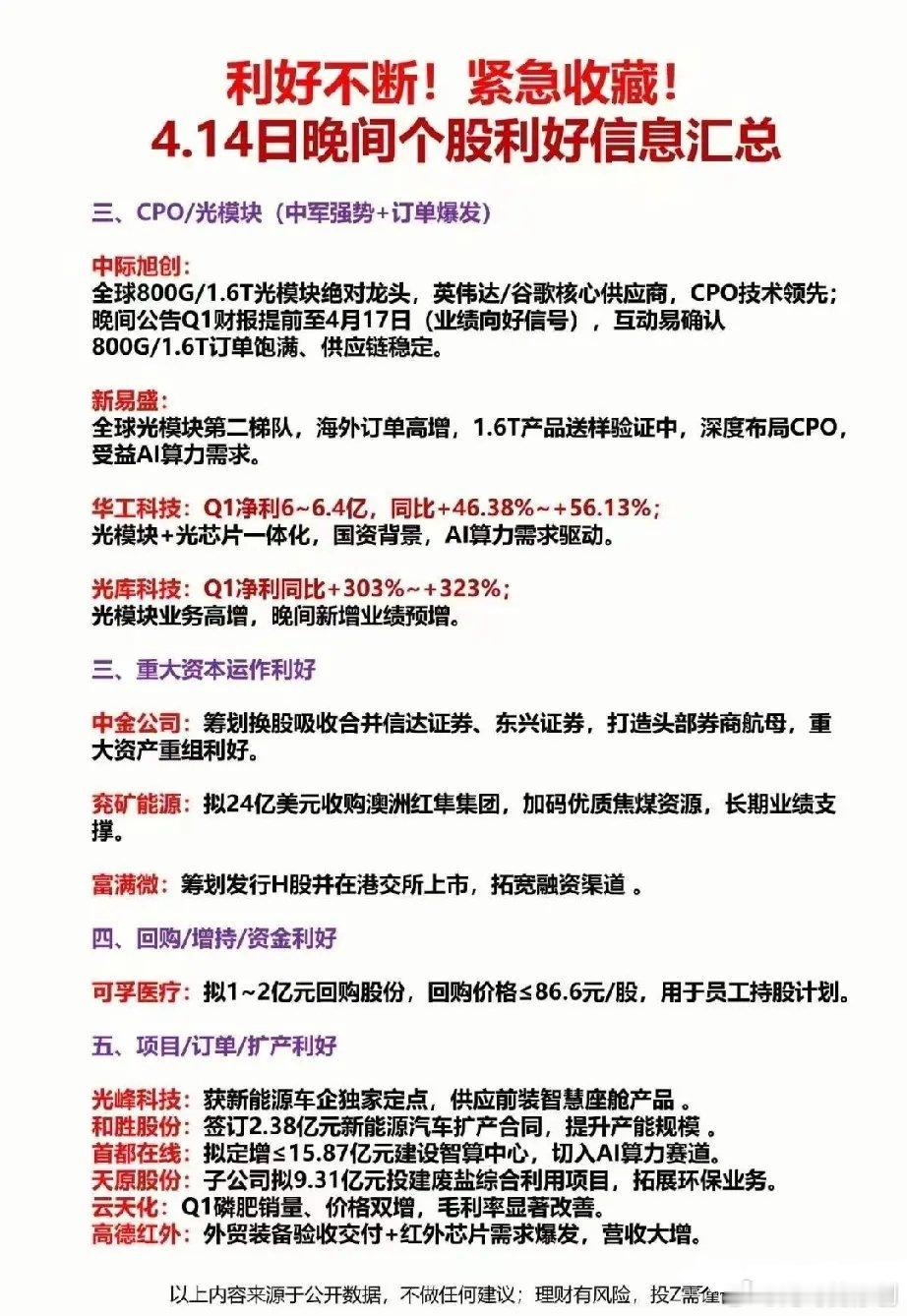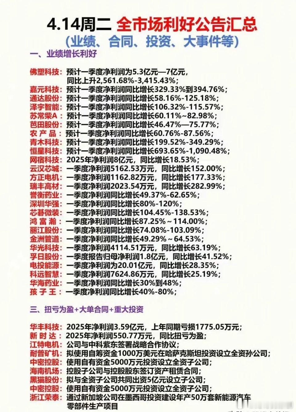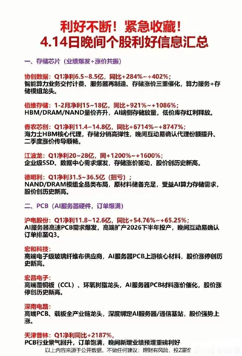 家人们!4.14晚间利好炸场!AI算力产业链全线爆发,存储芯片icon、PCB、CPO三大黄金赛道业绩炸裂,国产存储订单排期最长到2028年,机会直接拉满!存储芯片:业绩+涨价双共振icon,AI算力核心底座。协创数据iconQ1净利同比最高暴增402%,佰维icon存储1-2月净利同比超9倍,江波龙icon、德明利icon股价创历史新高;国产存储TOP10订单爆棚,长江存储在手订单超380亿,排期直达2028年底,长电科技icon、生益科技icon等龙头订单排到2027-2028年,AI存储需求彻底点燃行业景气度!PCB印制电路板:AI服务器硬件订单爆满,产业链全线起飞。沪电股份iconQ1净利同比最高增65.25%,订单排至Q3;宏和科技、宏昌电子icon股价涨停创历史新高,天津普林icon净利同比暴增2187%,AI服务器高速PCB需求爆发,上游材料、全产业链龙头集体走强!CPO/光模块:中军强势订单饱和,AI算力刚需爆发。中际旭创icon800G/1.6T光模块全球龙头,订单饱满供应链稳定;新易盛icon海外订单高增,华工科技icon、光库科技icon业绩高增,AI算力需求持续驱动光模块行业高景气!此外,中金公司重大重组、兖矿能源icon24亿美元收购、可孚医疗icon回购等多重利好加持,AI算力主线贯穿全年,核心赛道龙头业绩兑现+订单饱和,行情才刚刚启动!