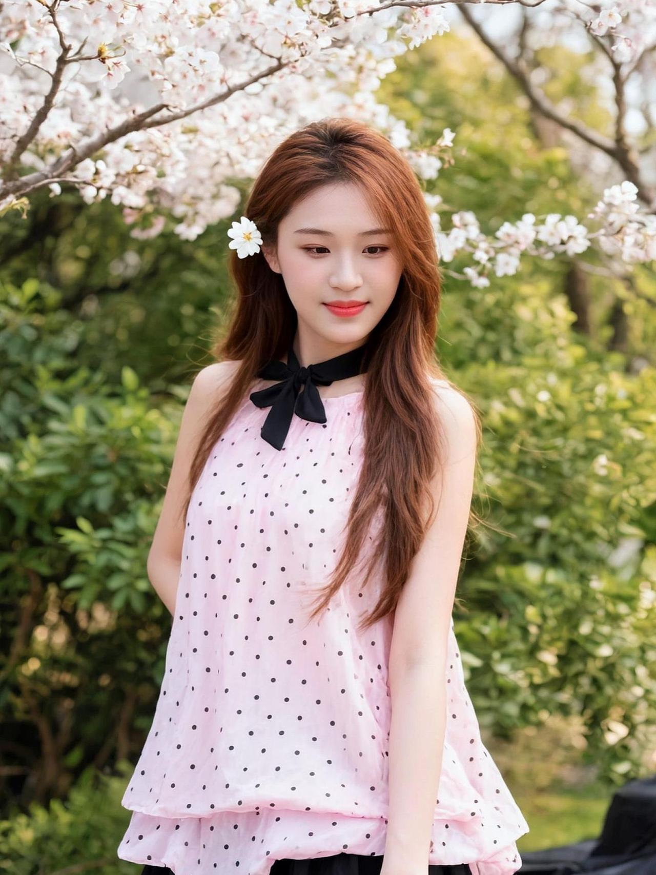 。在樱花树下,粉色的连衣裙与花瓣交织成一幅春日画卷。阳光透过树叶的缝隙,洒在她的发梢,仿佛为这一刻镀上了一层金色的光晕。背景中隐约可见的绿意,为这幅画面增添了一抹生机与活力。这样的场景,让人不禁想起那些关于青春与美好的诗句。