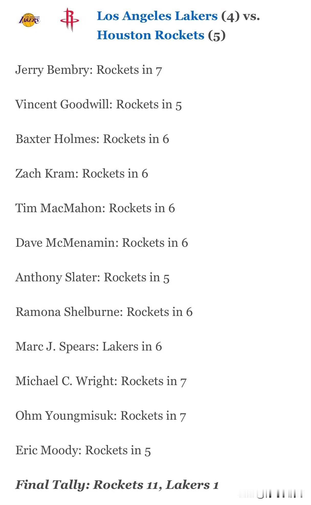 12位专家11人押注火箭!ESPN一边倒预测:湖人首轮凶多吉少! 湖人俨然成了季后赛人人喊打的球队,如过街老鼠一般,就因为他们在最后一周内伤了两个首发后场,这也是湖人队进攻能力最强的两个后卫,这在外人眼里是最致命的弱点。 偏偏最缺少控卫的火箭也选择了残阵湖人,双方一拍即合,彼此都想击中对方的弱点,就看谁能笑到最后了。 近日,外界开始对这轮系列赛进行预测,ESPN邀请专家与记者共12人参与预测湖人和火箭这组话题满满的系列赛,但是结果可能并不会很乐观。 假如娘家人都不看好自己,更何况别人呢,结果就是包括湖人跟队记者Dave McMenamin在内的11人看好火箭最终晋级,预测在5-7场内解决战斗,但是有一位资深记者Marc.J.Spears预测湖人6场内可以解决火箭,4-2这个结果满意吗?湖人 火箭 湖人队