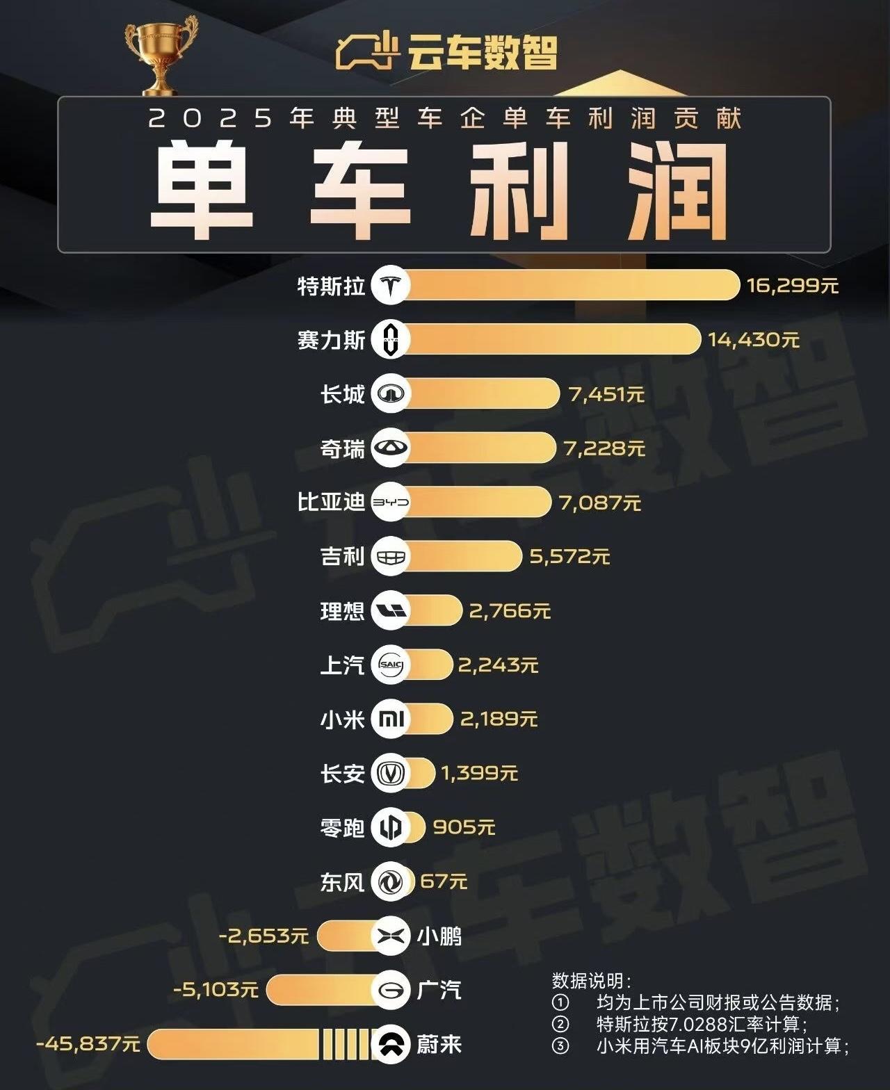 2025车企单车利润榜出炉 日前,云车数智发布2025年车企单车利润榜,特斯拉以16299元居首,赛力斯14430元紧随其后,长城、奇瑞、比亚迪单车利润超7000元。 小鹏、广汽、蔚来陷入亏损,蔚来单车亏损高达45837元,新能源车企盈利分化加剧。买车找谁一目了然啊。