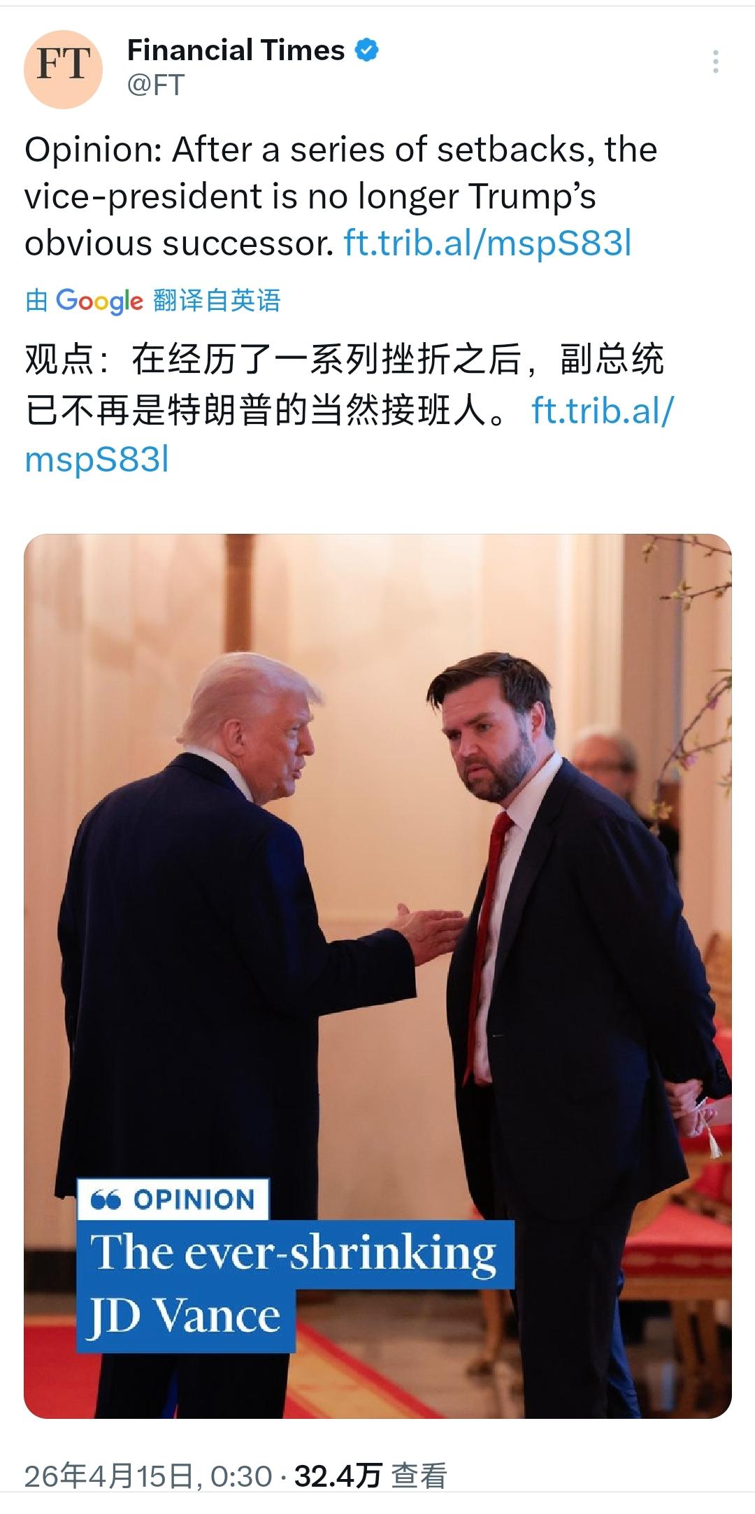 金融时报今天(4月15日)写道:“观点:在经历了一系列挫折之后,副总统已不再是特朗普的当然接班人。” [机智]评几句:万斯是用来背锅的,尤其是在维特科夫和库什纳这两位亲以色列的核心亲信将美伊谈判拖入死局后。这位曾被特朗普钦点的接班人,成了替白宫外交失败扛责的棋子。金融时报直言其不再是当然接班人,恰戳中特朗普团队的权斗本质:库什纳与维特科夫凭私交把持中东政策,把业余的地产商思维塞进外交谈判,让万斯领衔的谈判沦为笑柄,却让副总统独吞苦果。特朗普任期尚不足半,其用人向来任人唯亲且反复无常,昔日力捧的万斯说凉就凉,国务卿鲁比奥等势力仍在虎视眈眈,所谓接班人本就是特朗普权衡利弊的筹码,2028的棋局远未到定数时刻,谁能笑到最后,终究要看谁更合特朗普的一时心意。
