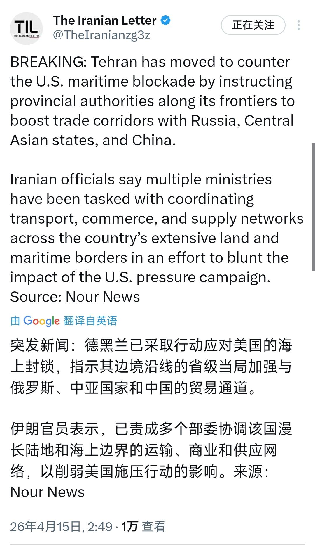 突发新闻:德黑兰已采取行动应对美国的海上封锁,指示其边境沿线的省级当局加强与俄罗斯,中亚国家和中国的贸易通道。伊朗官员表示,已责成多个部委协调该国漫长陆地和海上边界的运输,商业和供应网络,以削弱美国施压行动的影响。来源: Nour 新闻 [机智]评几句:伊朗下令强化与中俄及中亚国家的陆贸通道,以反制美国海上封锁,这是对美式单边施压的某种反制,更是用实际行动拆解美国的海上霸权围堵。面对美国毫无底线的极限施压,伊朗并未被动承压,而是主动破局,通过激活陆上联运网络打通贸易新动脉,既绕开了海上封锁,也让美国的单边制裁失去着力点。这一举措不仅让伊朗在高压下稳住了经贸基本盘,更让中俄伊及中亚的互联互通愈发紧密,形成了对抗霸权的合力。