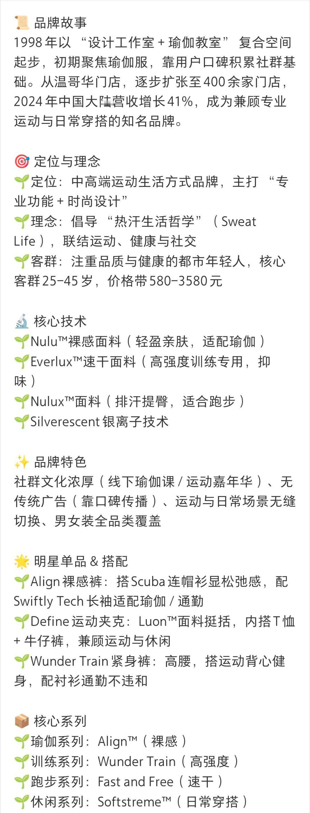 lululemon或与不孕等风险相关lululemon做为中高端运动生活方式品牌,被誉为瑜伽裤的皇后,靠用户口碑积累社群基础,客群为注重品质与健康的都市年轻人。
