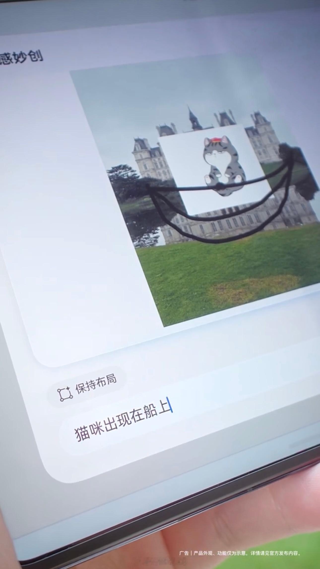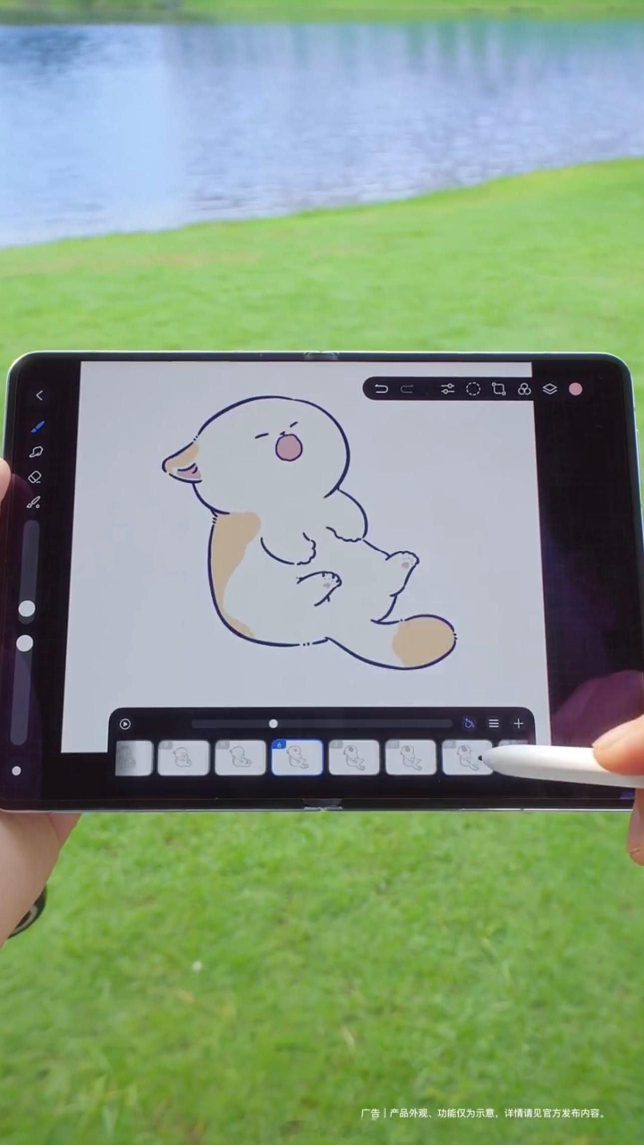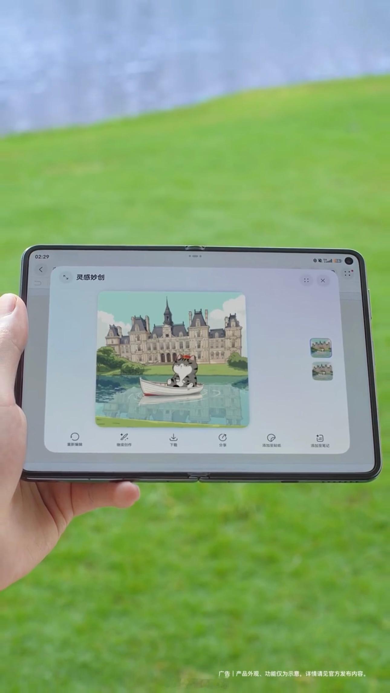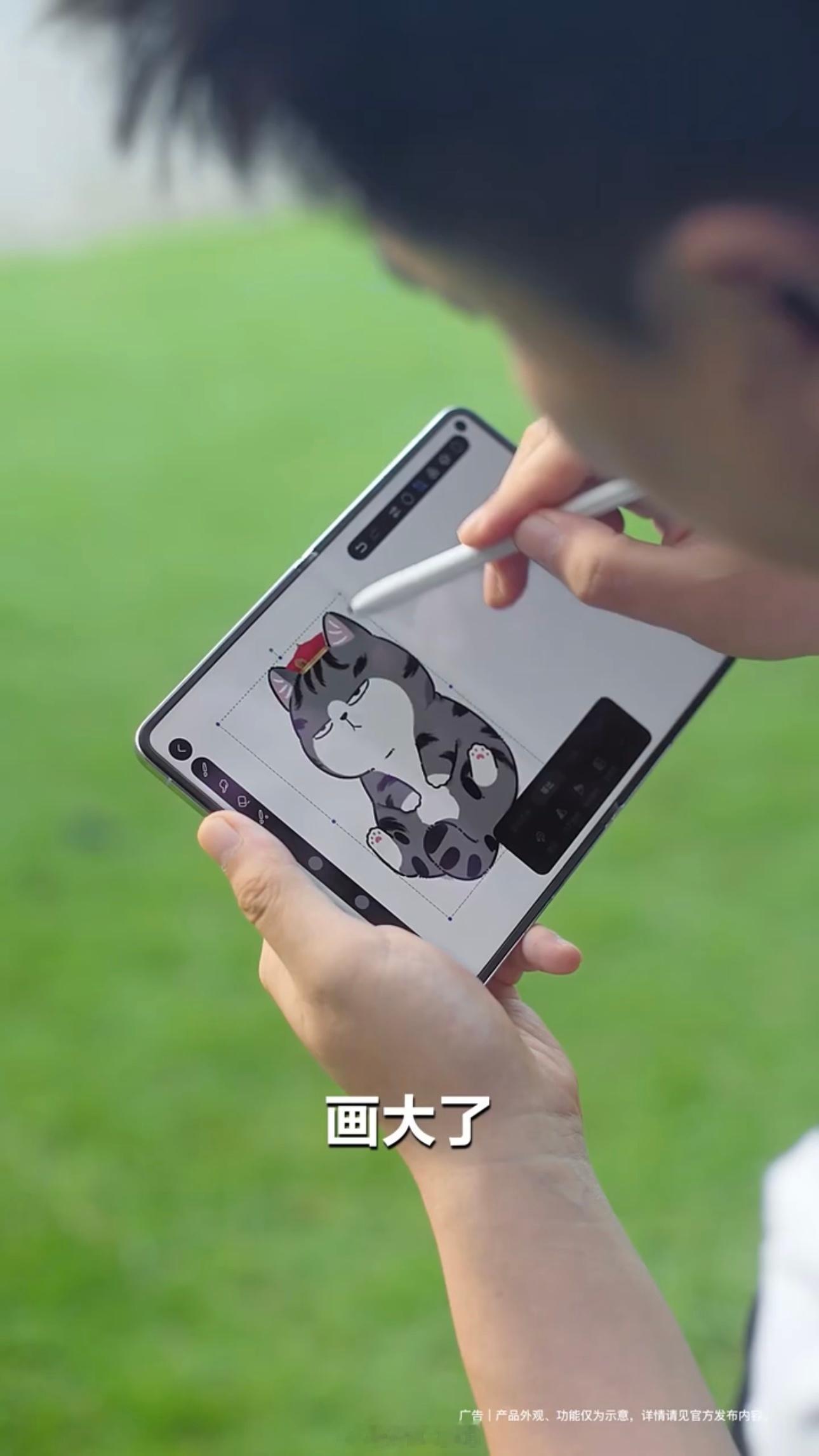 华为 Pura X Max 阔折叠展开之后就像一台 MatePad Mini,和 Mate X7 一样还支持 M-Pen 3,系统内新增涂鸦 App,提供灵感妙创和灵感妙创(专业)两个功能,动动嘴就能用小艺生成风格作品,蛮不错的。