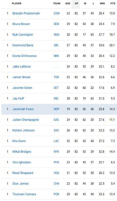 🥇🥇🥇NBA2025-2026赛季,全勤(82场)球员! 1.波杰姆斯基(勇士),37 胜 45 负,场均 28.4 分钟,得到 13.8 分 2.布朗(掘金),54 胜 28 负,场均 24.4 分钟,得到 7.9 分 3.巴布・卡林顿(奇才),17 胜 65 负,场均 27.7 分钟,得到 10.7 分 4.贝恩(魔术),45 胜 37 负,场均 33.6 分钟,得到 20.1 分 5.迪温琴佐(森林狼),49 胜 33 负,场均 30.4 分钟,得到 12.2 分 6.拉拉维亚(湖人),53 胜 29 负,场均 25.1 分钟,得到 8.2 分 7.谢德(猛龙),46 胜 36 负,场均 22.6 分钟,得到 6.6 分 8.贾文特・格林(活塞),60 胜 22 负,场均 17.6 分钟,得到 6.9 分 9.杰伊・赫夫(步行者),19 胜 63 负,场均 21.0 分钟,得到 9.5 分 10.耶利米・费尔斯(鹈鹕),26 胜 56 负,场均 25.8 分钟,得到 14.3 分 11.尚帕尼(马刺),62 胜 20 负,场均 27.6 分钟,得到 11.1 分 12.凯尔顿・约翰逊(马刺),62 胜 20 负,场均 23.3 分钟,得到 13.2 分 13.克里斯・邓恩(快船),42 胜 40 负,场均 27.2 分钟,得到 7.3 分 14.米卡尔・布里奇斯(尼克斯),53 胜 29 负,场均 32.8 分钟,得到 14.4 分 15.奥索・伊戈达罗(太阳),45 胜 37 负,场均 22.1 分钟,得到 6.5 分 16.里德・谢泼德(火箭),52 胜 30 负,场均 26.2 分钟,得到 13.5 分 17.西翁・詹姆斯(黄蜂),44 胜 38 负,场均 22.5 分钟,得到 5.4 分 18.卡马拉(开拓者),42 胜 40 负,场均 33.3 分钟,得到 13.4 分