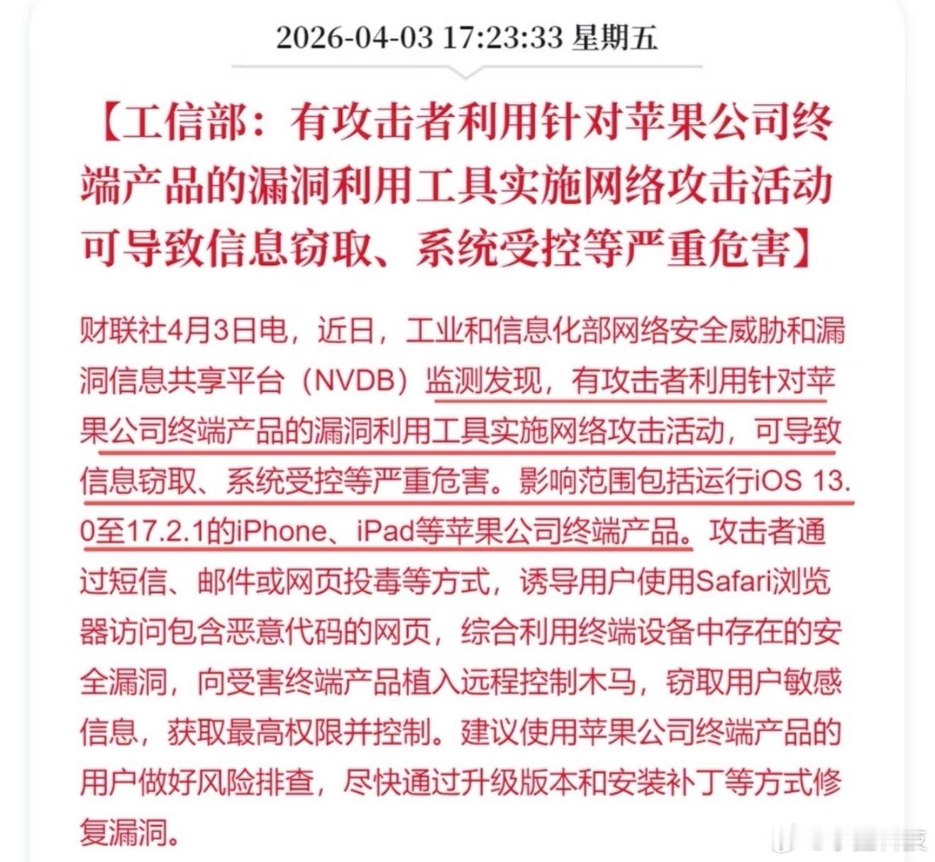 苹果官方发文提醒不更新的风险还是挺大的,G击者仅需诱导用户用浏览器点击一个链接,不用下载app、也不用输入密码,就能窃q你手机里的聊天记录、相册、银行卡信息,甚至完全控制手机,且相关G击工具包已泄露到互联网…当然备用机没什么重要信息可以考虑不更,毕竟上了新版本,性能和续航就差了些。