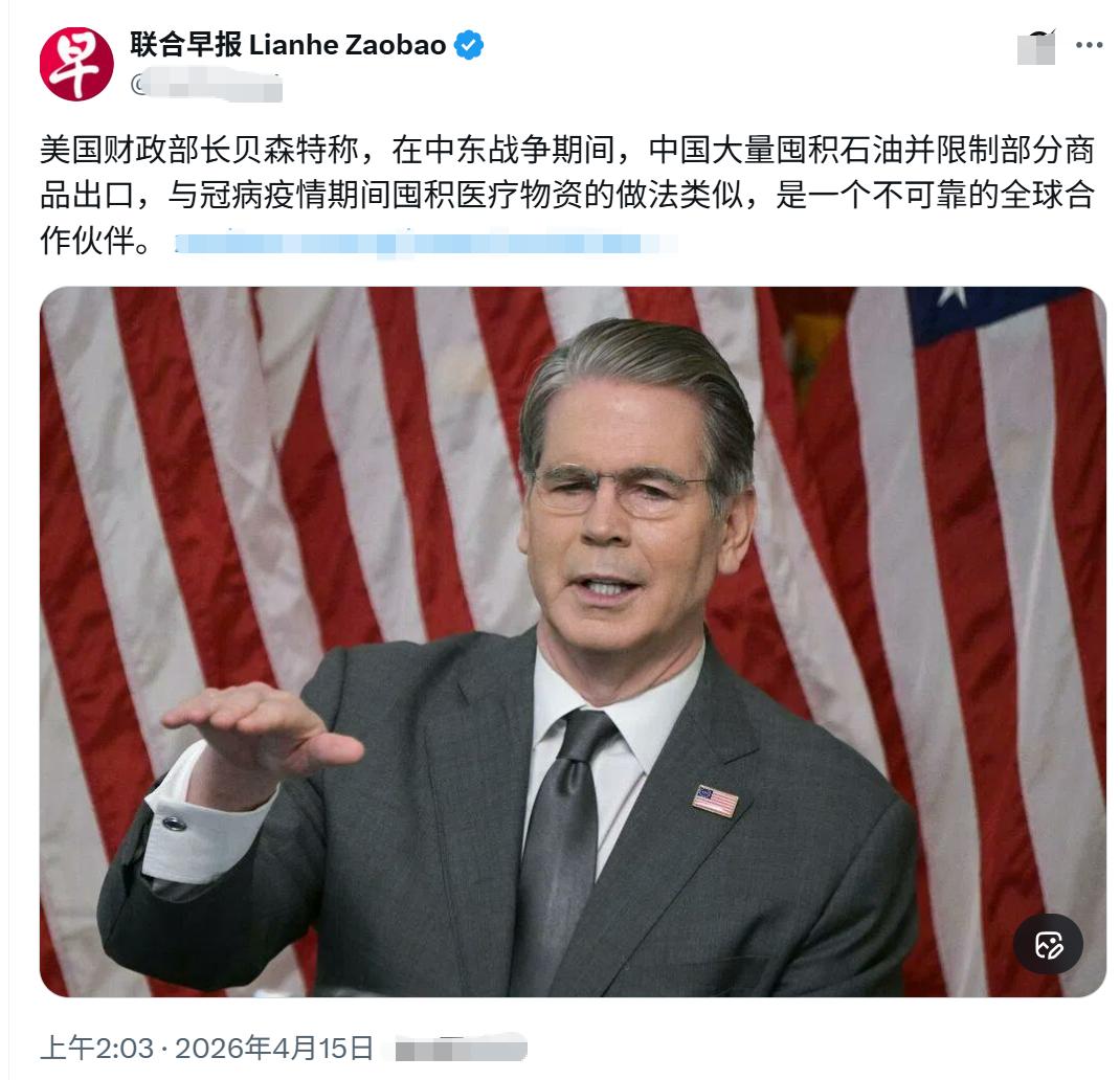 贝森特污蔑中国:在中东战争期间, 中国大量囤积石油并限制部分商品出口, 与新冠疫情囤积医疗物资的做法类似, 是一个不可靠的全球合作伙伴。 评一句: 人不要脸则无敌, 国家不要脸呢, 美国抢了委内瑞拉和伊朗石油, 切断霍尔木兹海峡, 是不是更不可靠?