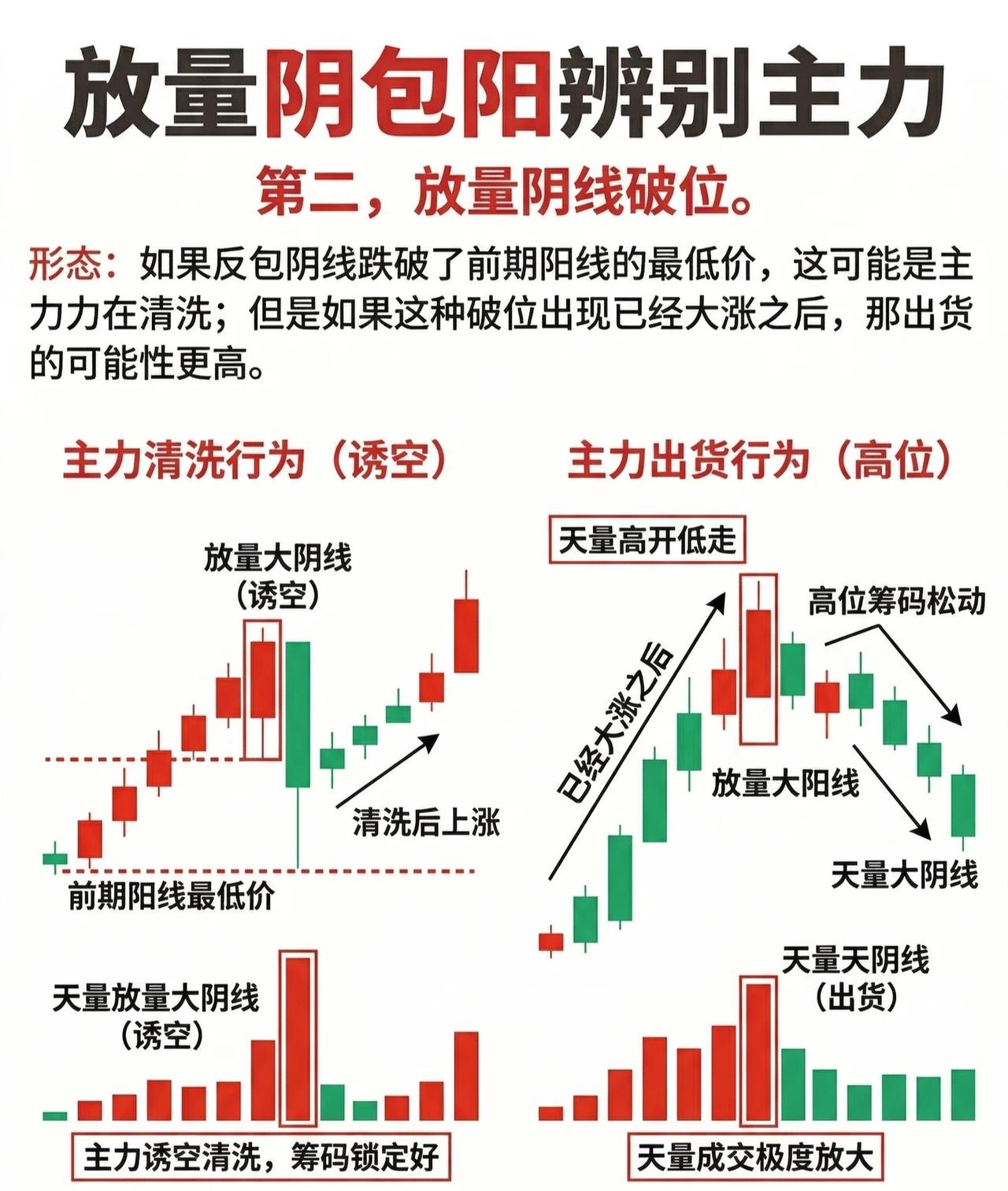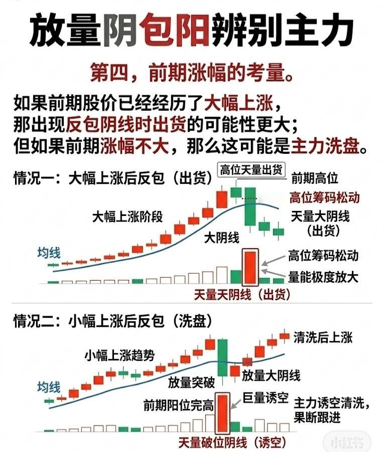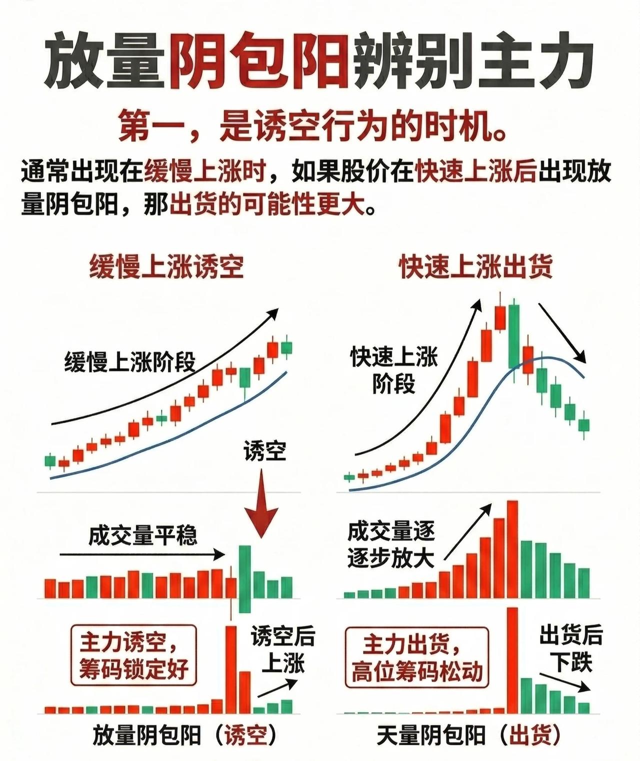 放量阴包阳:主力行为的四大辨别维度 一、时机维度:上涨节奏定诱空/出货 核心逻辑:放量阴包阳的“出场背景”(上涨节奏),是判断主力意图的关键前提。 - 缓慢上涨期·诱空信号:股价处于缓慢爬升阶段(趋势温和向上,成交量平稳)时出现放量阴包阳,主力更可能借“假摔”清洗浮筹(筹码锁定良好),后续往往重拾升势。 - 快速上涨期·出货信号:股价经历快速拉升后(短期涨幅大、情绪亢奋)出现放量阴包阳,主力“出货”概率更高(高位筹码松动,获利盘集中抛售),后续易步入下跌。 二、形态维度:阴线破位看洗盘/出货 核心逻辑:阴线是否跌破前期阳线最低价,结合“上涨阶段”可进一步区分意图。 - 低位/中位的破位·洗盘(诱空):若放量阴线跌破前期阳线最低价,但股价处于未大涨的低位/中位,通常是主力“暴力洗盘”(清洗不坚定筹码,筹码仍锁定),后续有望突破前高。 - 大涨后的破位·出货:若放量阴线跌破前期阳线最低价,且股价已经历大幅上涨(高位筹码松动),则主力“出货”概率剧增,后续易持续走弱。 三、次日K线:折回信号判洗盘/出货 核心逻辑:放量阴包阳后,次日K线的收盘价位置是“洗盘vs出货”的核心验证点。 - 严格标准(1天折回):若次日收盘价回到阴线实体的1/2以上(称为“折回K线”),说明主力资金回补筹码,是买入信号(主力洗盘吸筹,果断跟进)。 - 放宽标准(3天折回):若收盘价在3天内回到阴线实体的1/2以上,且伴随“量能阶梯式缩小”(筹码进一步锁定),同样验证“洗盘”意图,为黄金买点(主力诱空清洗,果断跟进)。 四、前期涨幅:涨幅大小定洗盘/出货 核心逻辑:股价前期涨幅幅度是判断主力意图的“基本面”参考。 - 大幅上涨后·出货:若前期股价已经历显著涨幅(高位),此时出现放量反包阴线,主力“出货”概率极大(高位筹码松动,获利了结需求强烈)。 - 小幅上涨后·洗盘:若前期股价涨幅有限(低位/中低位),放量反包阴线更可能是主力“洗盘”(借调整清洗浮筹,为后续拉升蓄力),后续往往重拾升势。 总结:四维联动,精准辨主力 通过“上涨时机+形态破位+次日折回+前期涨幅” 四大维度交叉验证,可更精准区分“诱空洗盘”与“高位出货”: - 诱空洗盘:缓慢上涨+低位破位+次日/3天折回+前期涨幅小; - 高位出货:快速上涨+高位破位+次日不折回+前期涨幅大。 (注:技术面分析需结合基本面、板块情绪、大盘环境等多维验证,避免单一信号误判。)