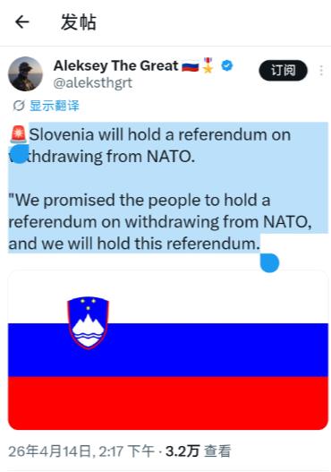 斯洛文尼亚将举行公投,以决定是否退出北约。 斯洛文尼亚要退出北约的公投,根本不是一时兴起,而是这个小国被北约绑架 22 年后,忍无可忍的必然反击,很多人觉得小国退北约是天方夜谭,但斯洛文尼亚的这次公投,注定会震动整个欧洲。 2004 年 3 月,斯洛文尼亚跟着波罗的海三国等国一起加入北约,当时的政府觉得,背靠北约这棵大树,国家安全就稳了,毕竟刚从南斯拉夫独立出来没几年,总想找个强大靠山。 可加入后才发现,北约根本不是什么保护伞,更像个不断吸血的 “军事债主”,从科索沃到阿富汗,再到后来的伊拉克、拉脱维亚,斯洛文尼亚被一次次要求派兵。 这个总人口才 200 万出头的小国,常备军不过七八千人,却要常年维持数百军人在外执行北约任务,本土国防力量被不断掏空,民众的不满早就压不住了。 更让斯洛文尼亚人寒心的是,北约越来越像美国的战争工具,俄乌冲突爆发后,北约不断拱火,把欧洲一步步推向战争边缘,完全不顾小国的安危。 斯洛文尼亚地处中欧与巴尔干交汇点,一旦欧洲战火重燃,它首当其冲,加入北约没带来安全,反而把自己绑在了美国的战车上,随时可能沦为炮灰。 2024 年北约华盛顿峰会后,这种不满彻底爆发,北约强行要求成员国到 2035 年把国防预算提高到 GDP 的 5%,而斯洛文尼亚 2024 年的军费占比才 1.29%,远低于北约要求。 对这个经济以服务业、制造业为主的小国来说,突然增加几倍军费,等于掏空国家财政,民生投入必然大幅缩水,政府根本没法向民众交代。 与此同时,美国在北约内的霸权越来越露骨,特朗普多次公开威胁,军费不达标的国家就该被 “踢出” 北约,西班牙、斯洛文尼亚等国都被点名批评,完全没把成员国主权放在眼里。 斯洛文尼亚的反北约情绪,早就有历史根源,从南斯拉夫时期起,这个国家就奉行中立与不结盟政策,反感大国军事集团。 冷战结束后,为了融入西方、获得安全保障才选择入约,但 20 多年过去,北约的本质暴露无遗,当初的安全承诺变成了战争绑架。 2006 年,斯洛文尼亚在野党就曾提出退出北约,近两年来,随着俄乌冲突持续、北约不断东扩、军费施压加剧,反北约声音从民间蔓延到政坛。 2026 年 3 月议会选举后,中左翼政府为兑现竞选承诺、安抚民意,正式宣布将举行退出北约全民公投,总理直言:“我们向民众承诺过,将就退出北约一事举行全民公投,而且我们一定会举行。” 这场公投表面是军事立场选择,实质是斯洛文尼亚对北约霸权的反抗,也是欧洲小国寻求战略自主、拒绝做大国附庸的觉醒。 斯洛文尼亚的退约公投,看似小国的政治博弈,实则戳中了北约当下最致命的结构性矛盾,也为欧洲中小国家敲响了警钟,北约自冷战后不断东扩,表面是扩大安全圈,本质是把欧洲各国绑上美国的地缘战车,让小国沦为大国博弈的耗材。 斯洛文尼亚的遭遇绝非个例,从西班牙到意大利,从匈牙利到克罗地亚,越来越多欧洲国家意识到,加入北约不仅没换来绝对安全,反而要承担额外军费、外派士兵、卷入冲突的三重代价,国防自主被架空,外交政策被绑架,最终沦为美国的军事附庸。 从历史看,斯洛文尼亚的选择有其深层逻辑,这个国家从奥匈帝国统治到南斯拉夫联邦,再到独立后加入欧盟与北约,始终在大国夹缝中求生存。 当年为了安全与融入西方选择入约,如今发现北约已从防御性组织变成对抗性工具,违背了初衷,尤其俄乌冲突后,北约彻底抛弃中立与调解角色,一心拱火递刀,让欧洲和平环境持续恶化。 对斯洛文尼亚这样的小国而言,安全不是依附大国,而是保持战略自主、避免卷入集团对抗。 这场公投更有强烈示范效应,如果斯洛文尼亚成功退约,可能引发连锁反应,让更多对北约不满的小国跟进,这不仅会动摇北约东扩成果,更会冲击美国主导的欧洲安全架构。 北约长期靠 “俄罗斯威胁” 维持团结,但当威胁叙事抵不过现实利益损害时,分裂就难以避免。 对中国而言,斯洛文尼亚的选择印证了反对集团政治、坚持共同安全的正确性,世界不需要制造对抗的军事集团,而需要平等协商、相互尊重的安全架构,小国更有权选择符合自身利益的道路,而非被迫选边站。 斯洛文尼亚公投无论结果如何,都已发出信号,欧洲小国不愿再做北约附庸,和平自主才是人心所向,北约若继续霸权路线,只会加速离心,最终走向瓦解。