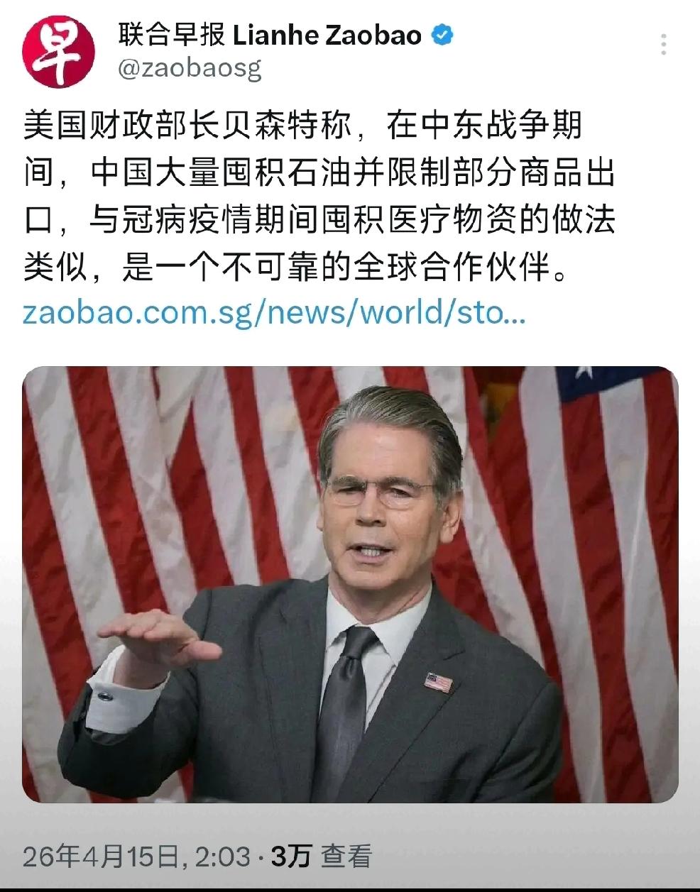 2026年4月15日,联合早报发文:“美国财政部长贝森特称,在中东战争期间,中国大量囤积石油并限制部分商品出口,与冠病疫情期间囤积医疗物资的做法类似,是一个不可靠的全球合作伙伴” 个人认为:美国财政部长贝森特又在栽赃陷害,恶意抹黑中国。 如果要是说没信誉,如果要是说侵略,如果要是说撒谎,那么,个人认为:美国无疑是当今全球当之无愧的遥遥领先的第一国。 当下的美国领导层有何脸面?有何信誉?在台上夸夸其谈指责别人,真是恬不知耻。