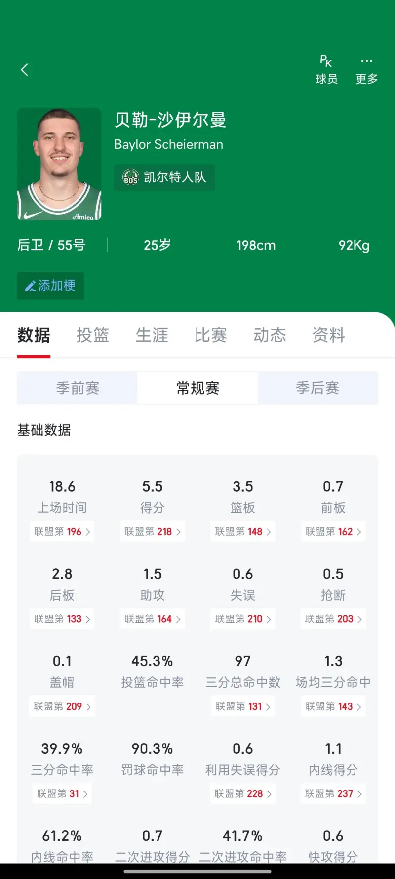 沙伊尔曼,本赛季出战77场,其中20场首发,场均出战18.6分钟,场均5.5分+3.5篮板+1.5助攻,三分球命中率39.9%,但这是整个赛季沙伊尔曼的数据,前半赛季受西蒙斯位置的压缩,沙伊尔曼几乎是板凳最末端。西蒙斯被交易后,沙伊尔曼的场均得分是9.1分。组织前锋一直在市场上属于稀缺资源,组织前锋可以极大的丰富球队战术,未来的沙伊尔曼也会成为凯尔特人的香饽饽。