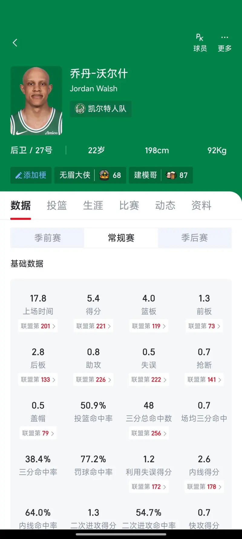 沃尔什,今年进步喜人。去年他上空蓝都能偏的离谱,当时我还以为他可能无缘NBA了。但是今年的他出战68场,其中25场首发。场均5.4分+4篮板此外还有0.7个抢断。沃尔什今年有效弥补了霍乐迪出走60%的空缺。如果今年没有沃尔什,凯尔特人防守会大打折扣,无法形成有效威慑。未来沃尔什估计能进首发,1.98米的身高,速度很快,有一定的三分球能力,能从二号位顶到四号位,有他在可以有效解放塔图姆跟杰伦布朗,并且给球队带来活力,但是他还是需要把他三分再稳定下来。