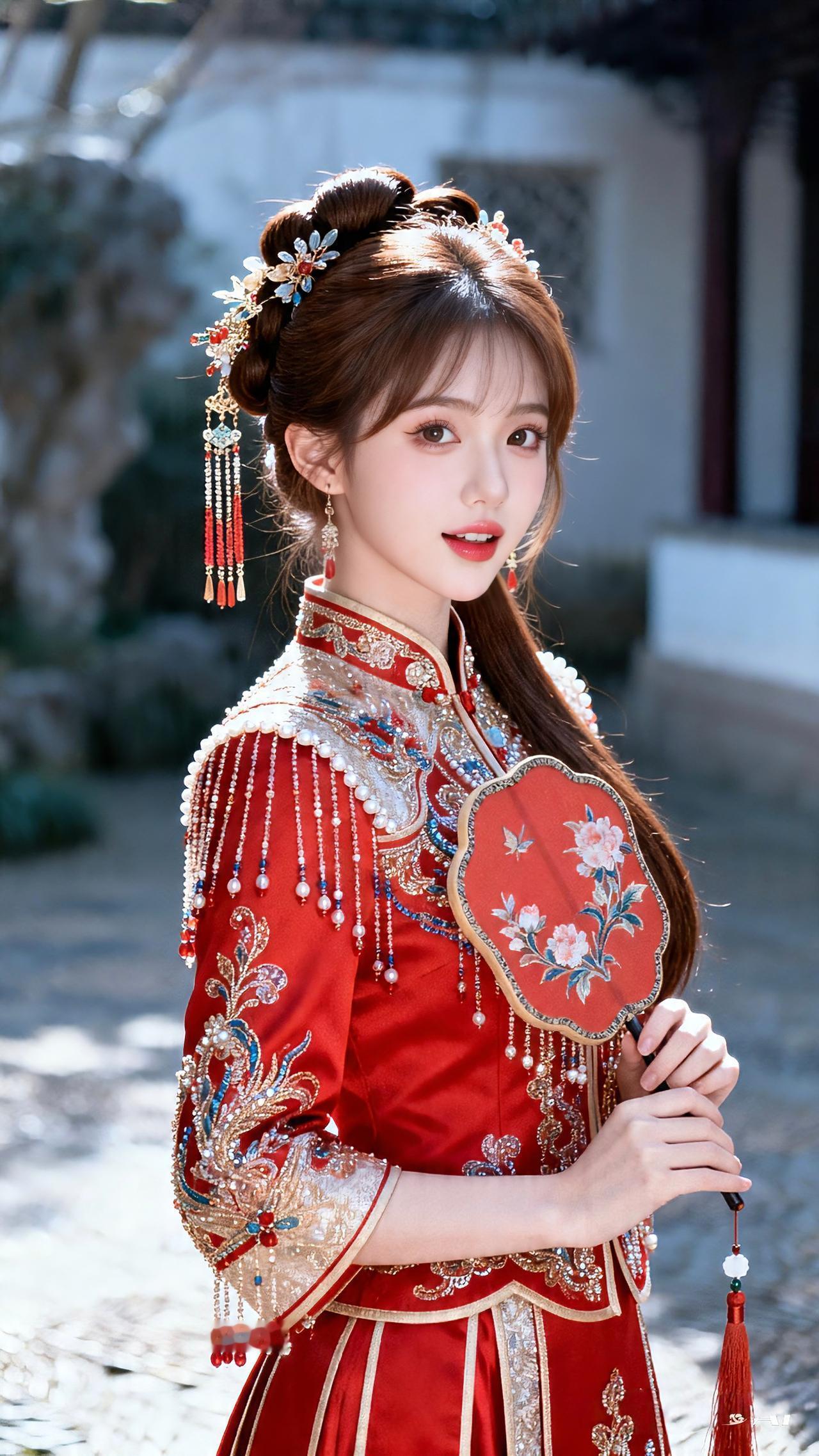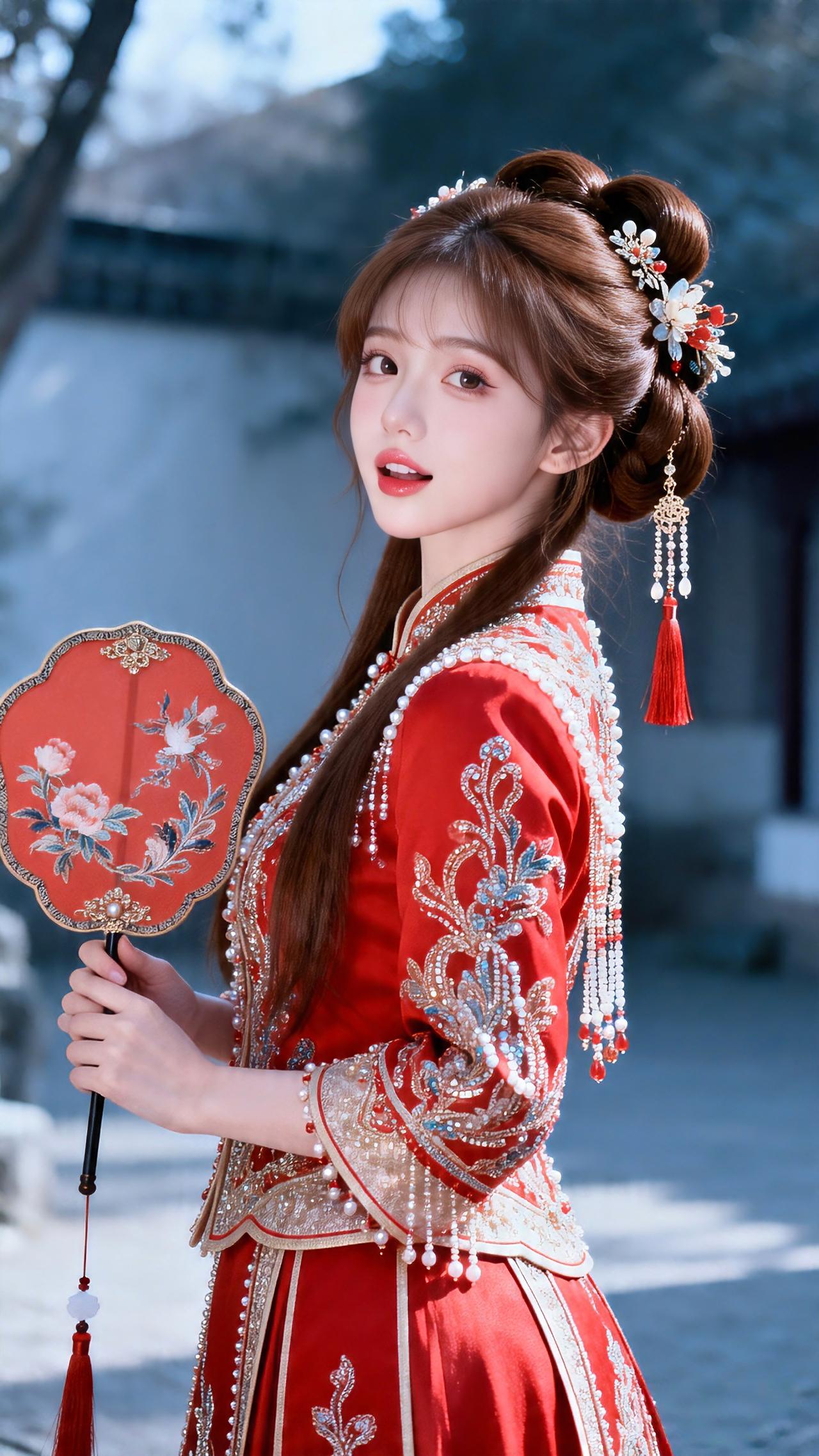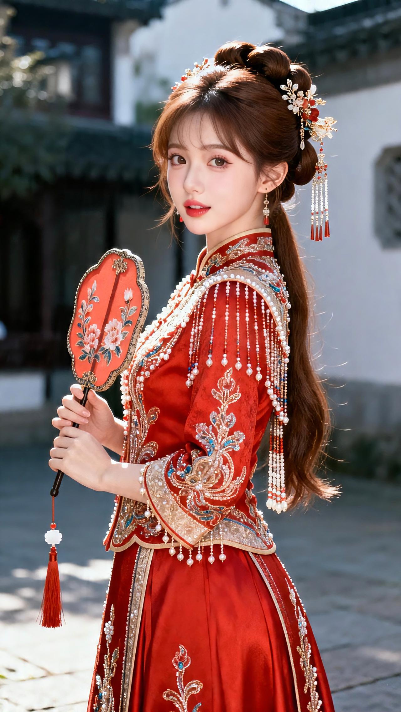 穿越时空的中国古典美人,手持团扇,红衣华贵,韵味十足。中国风古韵穿搭古典美学穿