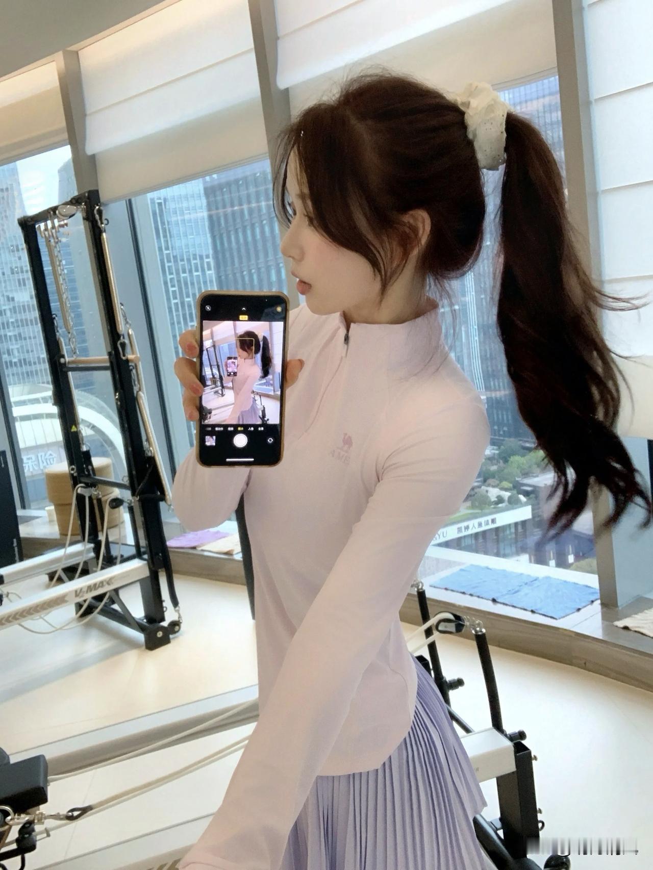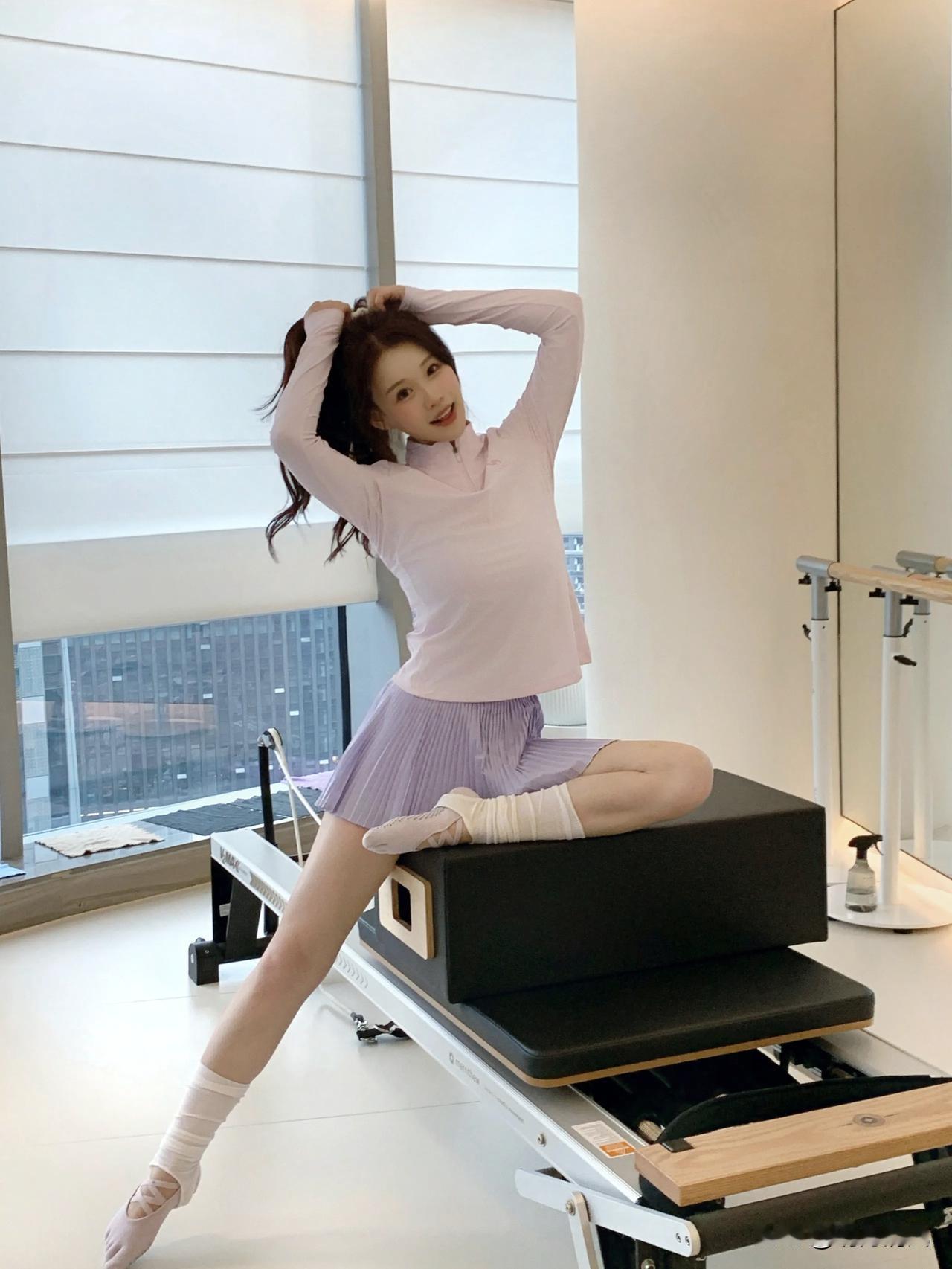 普拉提拍照,两个动作轻松拿捏“甜妹身材” 室内普拉提拍照,不用硬凹造型,选对动作和光线,甜美和身材线条都能兼顾。今天分享两个我常拍的实用小动作。 1. 倚坐把杆抱脚踝 侧身轻坐在木质把杆上,一条腿自然垂落,另一条腿弯曲踩在横杆上,双手抱住脚踝。关键点是腰背挺直,不要含胸。百叶窗的侧光打过来,面部轮廓更立体,白色防滑袜露出来,画面自然带出一种练功间隙的松弛感。 2. 坐器械单腿伸展 坐在普拉提床的黑盒上,一条腿向侧下方伸直、脚背绷起,另一条腿弯曲收拢。手轻轻搭在弯曲的脚踝处,身体微侧。这个动作能让腿部线条拉得很长,头发带点凌乱感更好看,笑容明媚一些,整个人显得舒展又有活力。 拍照时记得把背景留干净,用自然光,粉色上衣配浅紫百褶裙本身就够温柔,不用加太多道具。其他的动作直接上图,你学会了吗?