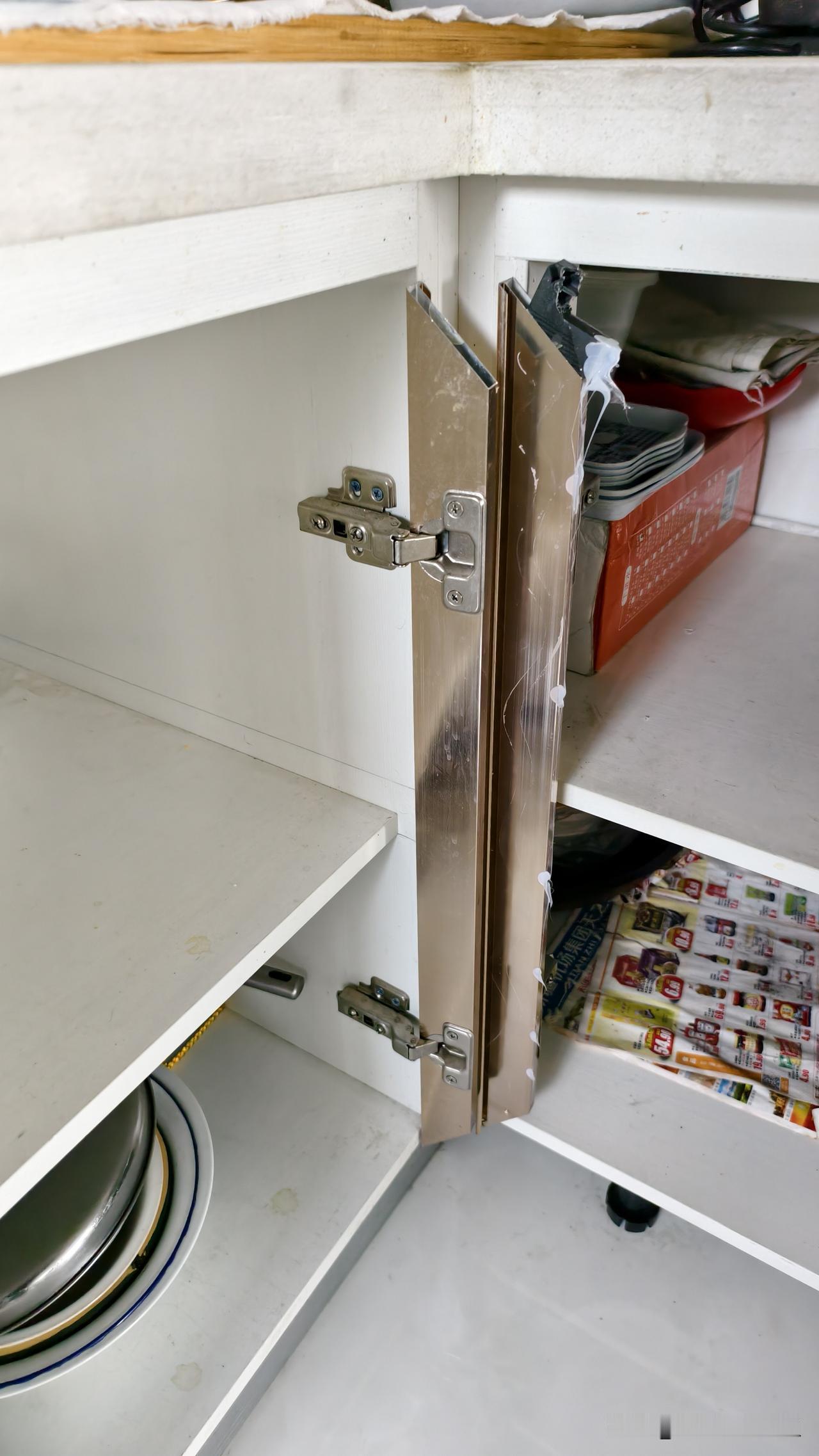 奉劝大家千万不要用这种金刚门了! 时间一长,胶老化之后,门就散架了,边角的非常锋利,很容易割到手。粉丝家里面装修没几年,门已经掉的差不多了,联系我进行更换。 看了一下现场,柜体没有变形,握钉力还可以,只需要换门 两个半小时,拆除+安装,换了新的合页和门板。 整个厨房焕然一新,干净整洁。