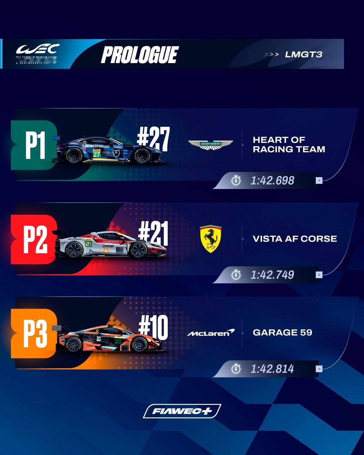 LMGT3组由THoR的阿斯顿·马丁Vantage AMR LMGT3 EVO拿到最速圈,行驶里程上则是两台保时捷911 LMGT3 R领先。