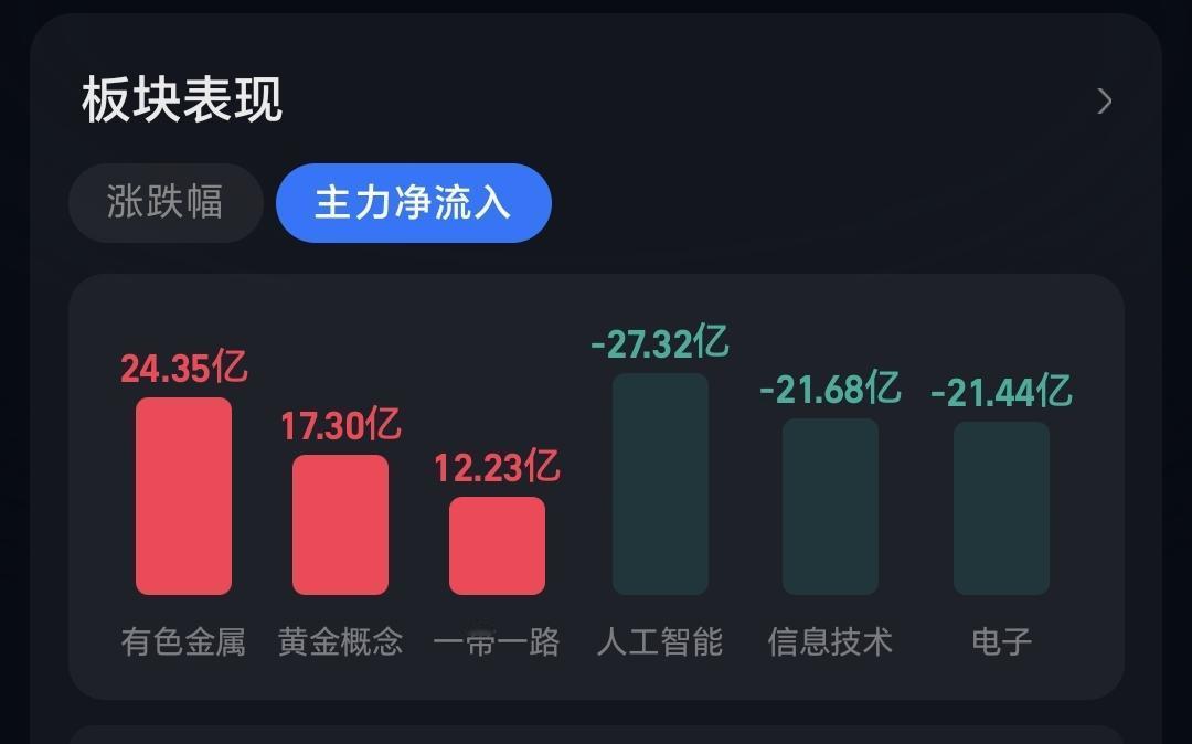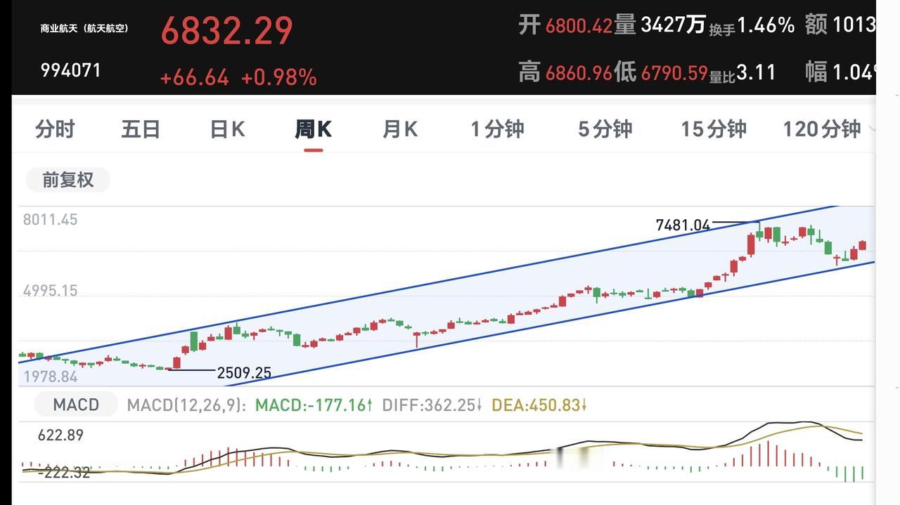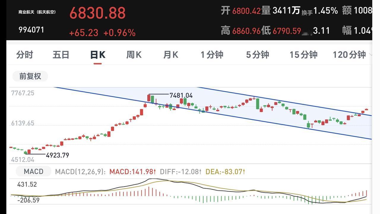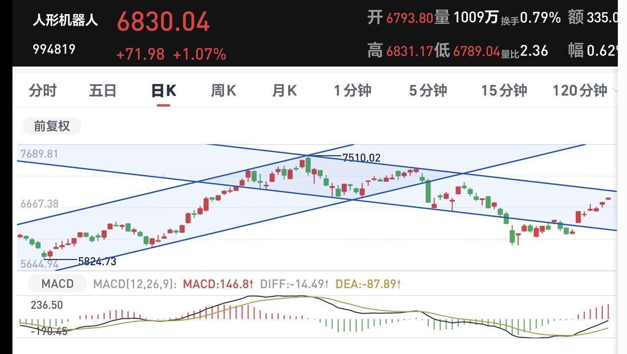 基金:机器人板块和商业航天板块应该怎么办 今天市场高开,三大指数都是高开,创业板指开盘上涨了1.06%,开于3596点,上证指数开盘上涨了0.32%,开于4039点。 盘以后指数小幅度震荡,盘中最高4046点,盘中最低4034点,上下只有12个点的幅度,黄色线在蓝色线下方,两条线之间的敞口不大,黄色线能够跟随蓝色线涨跌,继续观察两条线的位置会不会有变化。 整个股票市场,上涨2977家,下跌2288家,两市累计成交7557亿,相比于上一个交易日同期放量了640亿,主力资金净流出90亿。 主力资金净流入最多的三个板块是:有色金属板块,黄金板块,一带一路板块,主力资金净流出最多的三个板块是:人工智能板块,信息技术板块,电子板块。 整个市场上涨幅度最大的三个板块是:商业航天板块,恒生科技板块,机器人板块,下跌幅度最大的三个板块是:锂矿板块,煤炭板块,油气资源板块。 持有基金现在盘中估值上涨了2017元,盈利金额最大的三个板块是:创新药板块,芯片半导体板块,先进制造板块,亏损金额最大的三个板块是:新能源汽车板块,证券板块,AI应用板块。 商业航天板块日线级别已经上涨突破了下跌通道的上轨线,今天是继续上涨,如果这个突破是有效突破,短线的人可以考虑要不要进场。 商业航天板块周线级别处于上涨通道中,这个板块保持着上涨趋势,今天的上涨并没有改变这样的上涨趋势,长线持有的人可以继续持有。 机器人板块今天上涨,这个板块处于日线级别下跌通道中,今天的上涨并没有能够突破下跌通道的上轨线,今天的上涨还没有改变日线级别的下跌趋势,短线的人继续注意风险,想进场的人耐心等待上涨突破日线级别下跌通道上轨线的时候,再考虑要不要进场。 机器人板块周线级别处于上涨趋势破位中,今天的上涨来到了这个上涨通道下轨线附近,近期观察能不能重新回到原来的上涨通道中,还是会在这里遇阻回落。 现在的成交量相比于昨天放量超过了800亿,但指数的上涨幅度并不大,还是存在着放量滞涨的嫌疑,继续观察盘面的变化。 大家帮忙评论点赞,转发和分享,谢谢大家的支持。