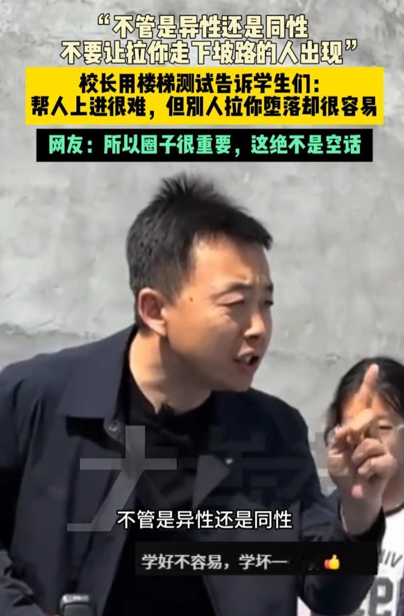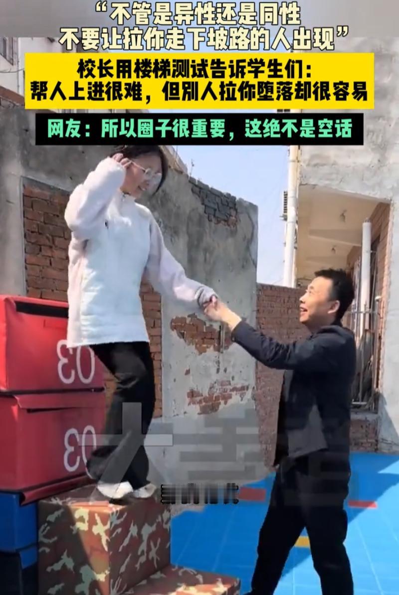 “这才是教书育人!”河北,一位校长让几名女学生站在楼梯上把他拉上去,结果上面的女生都被他给拉了下来,正当女生们一脸疑惑时,校长说出了他的良苦用心:不要让拉你走下坡路的人出现! 视频中,校长让女生站在楼梯上,然后伸手让女生拉他上去,可女生刚抓住他的手,校长就会把女生往下拉,就这样,几名女生都被他从上面拽了下来 随后他解释说:看我把你们一拉就拉下来了对不对,你们现在是一群漂亮的小女孩,你们生活无忧无虑,并不是因为你们高高在上,而是父母在下面托举,所以你们要清楚一点,不要轻易让把你们拉下来那个人出现,不管是异性还是同性,帮人上进很难,但被拉下来却很容易 不得不说,校长的操作很高级。他没用俯视姿态训人,而是自己站在低处,让学生站高处,然后让她们亲眼看到“被拉下”有多简单。这种反转式的教育,比苦口婆心有效得多。一个动作胜过千言万语,因为人教人教不会,事教人一次就够了 很多人说现在孩子听不进道理,其实未必是孩子的问题,是方式太老套。你越端着,孩子越关上门。校长这种方式好就好在接地气,没有高高在上的说教,没有假大空的套话,让学生自己在体验里悟出来 往深了说,他讲的不只是防坏人,更是在提醒:成长这件事,守住比冲上去还难。生活里真正危险的不是明面上的对手,而是那些借着“为你好”的名义,悄悄拉你下来的人。可能是鼓动你逃课的哥们儿,也可能是劝你别太拼的所谓朋友 父母在底下托举,托的是你的起点、你的底气、你摔下来时有个缓冲。但托举不等于替你走路。往上走的路本来就费劲,可一旦被拉下来,连缓冲都没了 校长的潜台词其实就是:别辜负了底下托你的人,也别高估了自己站得有多稳
