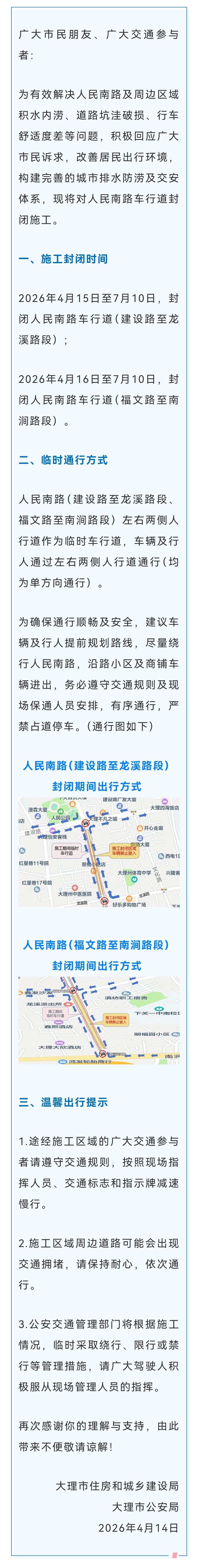 🚧自2026年4月15日起,大理市人民南路将进行封闭施工。 4月15日至7月10日,建设路至龙溪路段的车行道将封闭;4月16日至7月10日,福文路至南涧路段的车行道也将封闭。此次施工旨在解决人民南路及周边的积水内涝、道路坑洼等问题,改善出行环境。 若施工期间遭遇恶劣天气,工期可能会延长。施工将分阶段进行,届时会把人行道改造为临时车行道。大家出行前需提前规划好路线,避开施工路段,以免遭遇堵车,影响心情。 施工