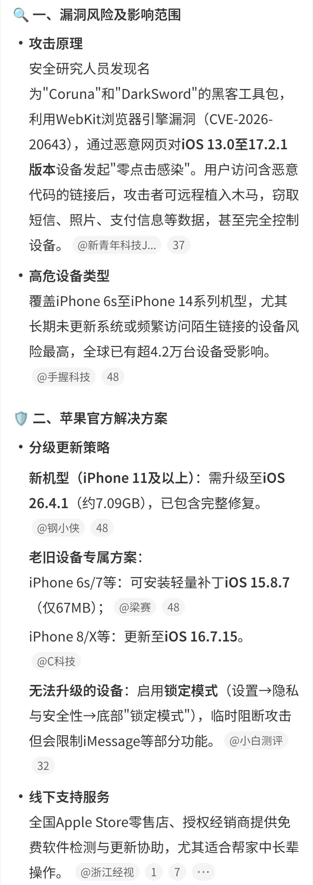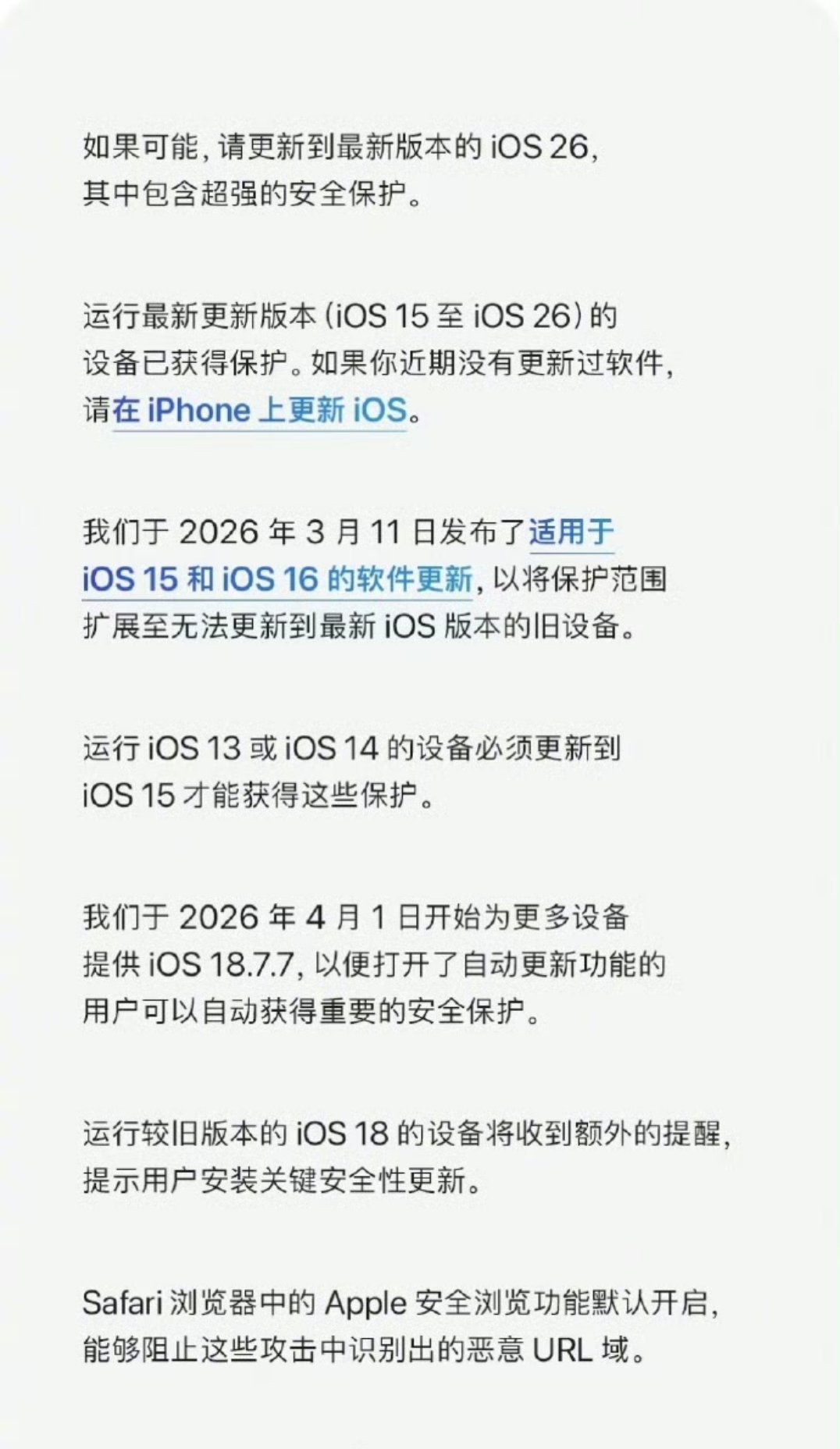 苹果官方发文提醒借助恶意网页内容,对过时版本的iOS发起攻击,用户一旦访问含恶意代码的网页,攻击者可远程植入木马,窃取短信、照片、支付信息等敏感数据,甚至完全控制设备。所以啊,该升级就升级吧,毕竟更新升级用不了多少时间,但出事了损失就大了~