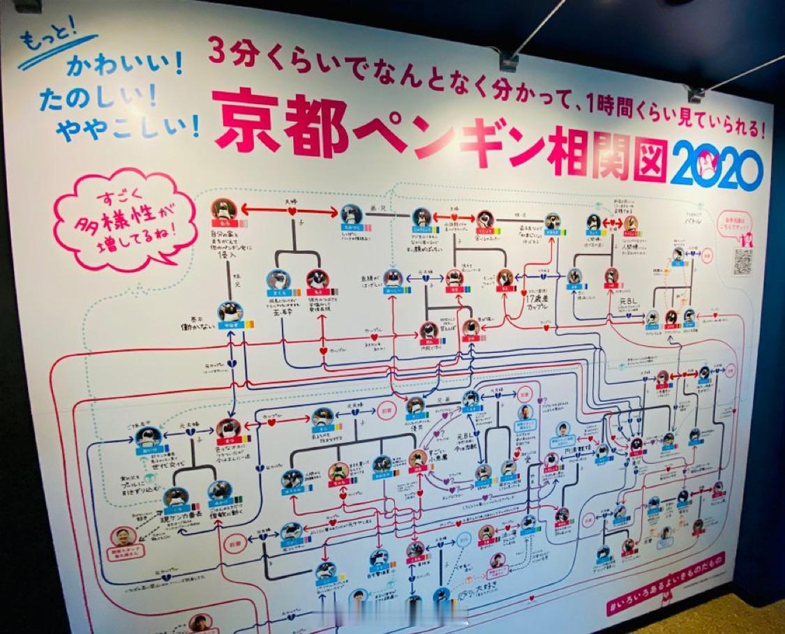 日本京都水族馆内有一面墙大小的流程图,记录着馆内企鹅之间的恋爱关系、分手以及各种情感纠葛。其中,红色爱心代表配对成功的情侣,蓝色代表分手,紫色代表关系复杂,黄色代表朋友关系,绿色则代表互有嫌隙的敌人。