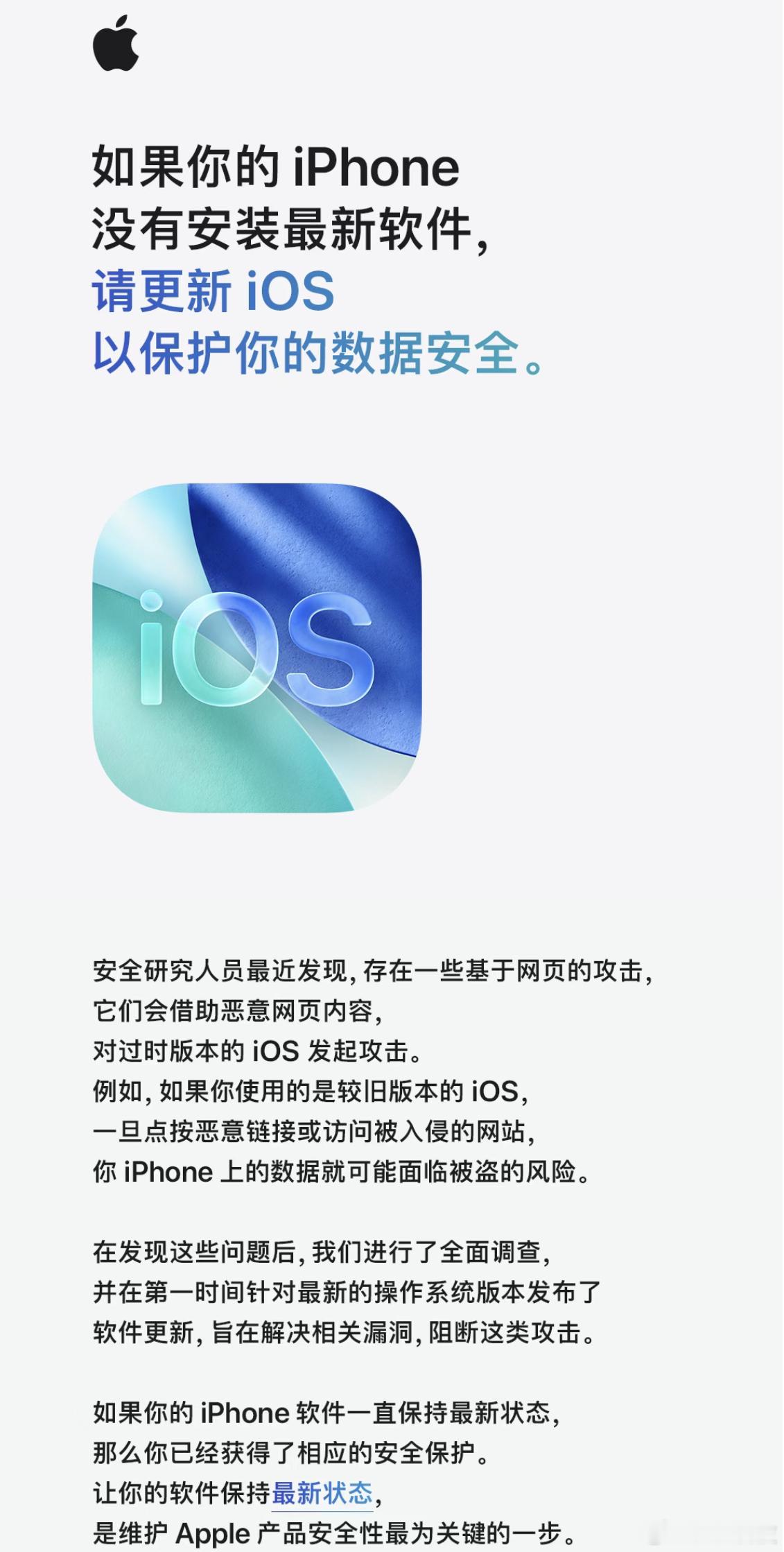 苹果官方发文提醒大家都更新了吗?苹果官方催你了,为了你的手机安全,建议你保持使用
