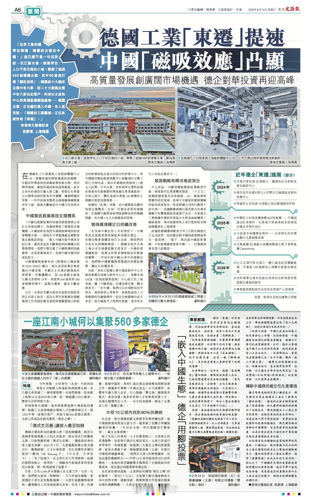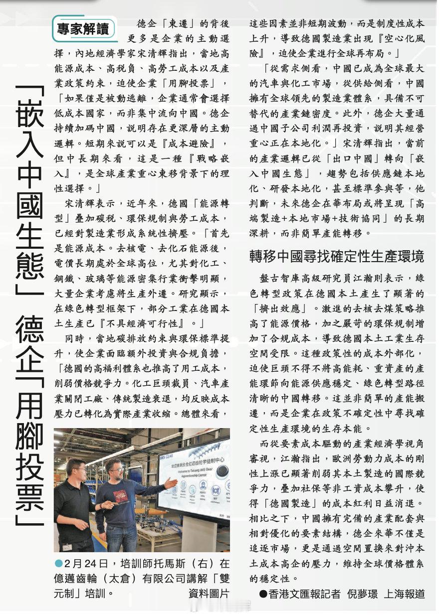 德企东迁 【[專家解讀]"嵌入中國生態" 德企"用腳投票"】(記者 倪夢璟 上海報道)德企「東遷」的背後更多是企業的主動選擇,內地經濟學家宋清輝指出,當地高能源成本、高稅負、高勞工成本以及產業政策約束,迫使企業「用腳投票」,「如果僅是被動逃離,企業通常會選擇低成本國家,而非集中流向中國。德企持續加碼中國,說明存在更深層的主動邏輯。短期來說可以是『成本避險』,但中長期來看,這是一種『戰略嵌入』,是全球產業重心東移背景下的理性選擇。」【專家解讀】「嵌入中國生態」 德企「用腳投票」 清晖智库