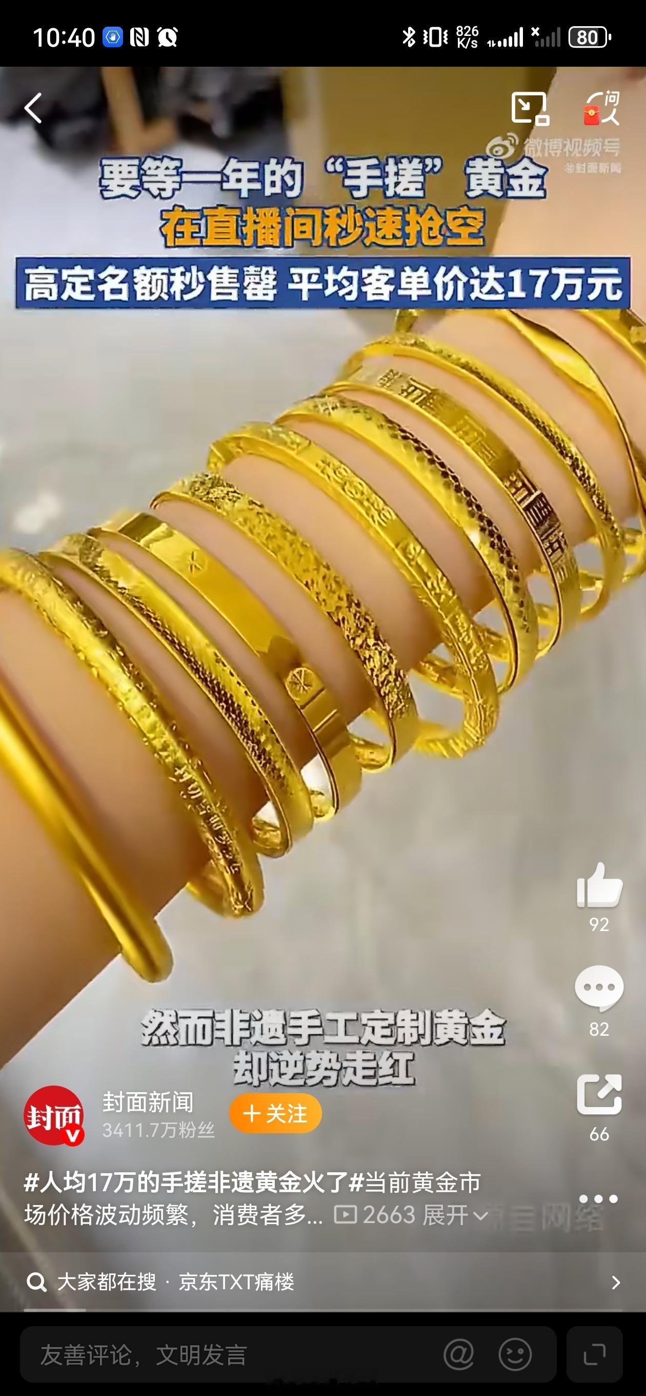 在金价波动的当下,非遗手工黄金逆势走红。近期京东直播中,采用花丝、錾刻等非遗技艺的手工金饰,平均客单价竟超17万元,最高订单达60万元。