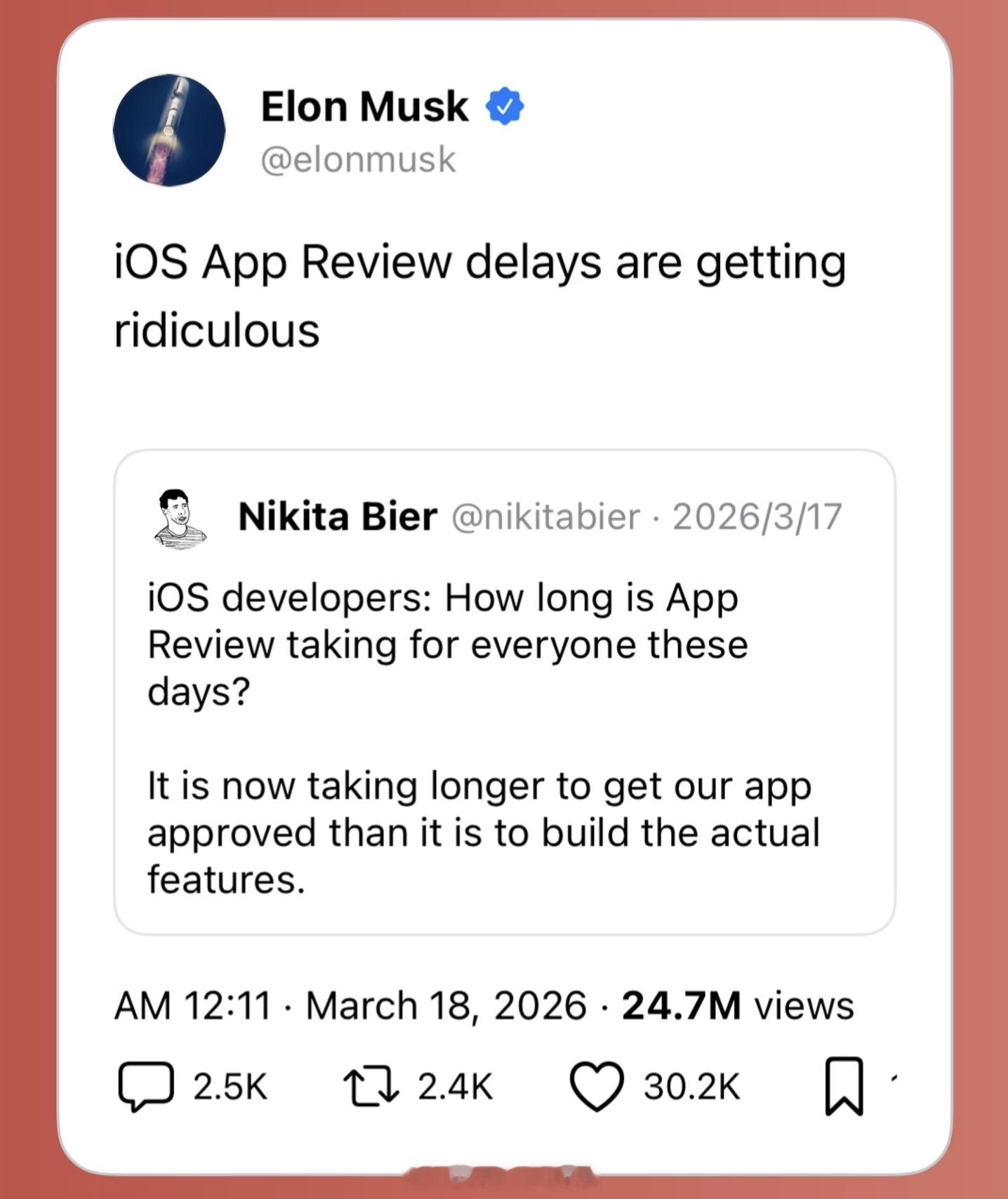 就连马斯克都忍不住吐槽审核太慢了,但还是有大量的开发者蜂拥而至,因为好用