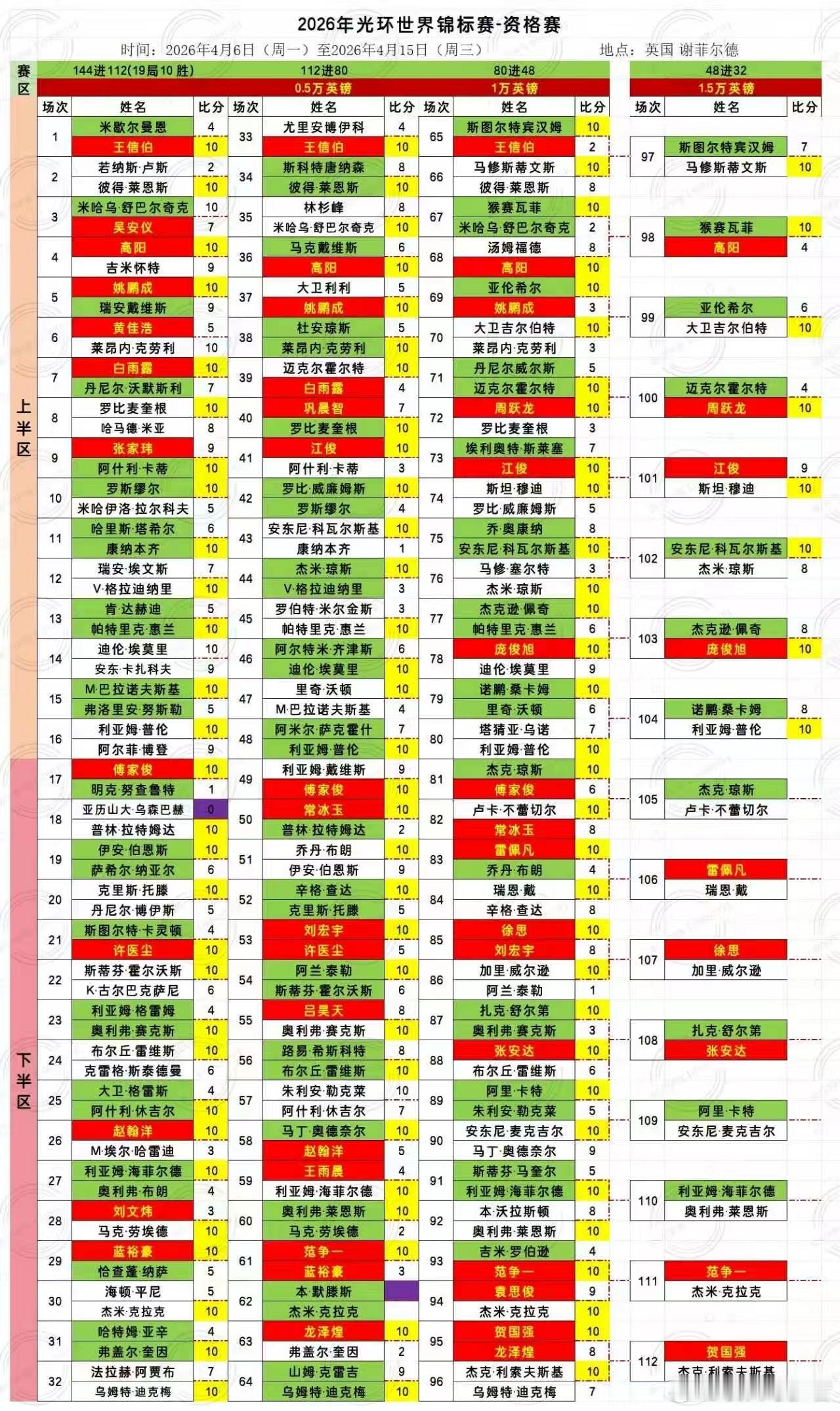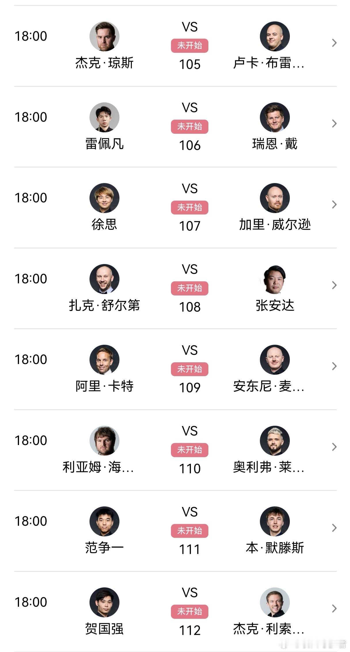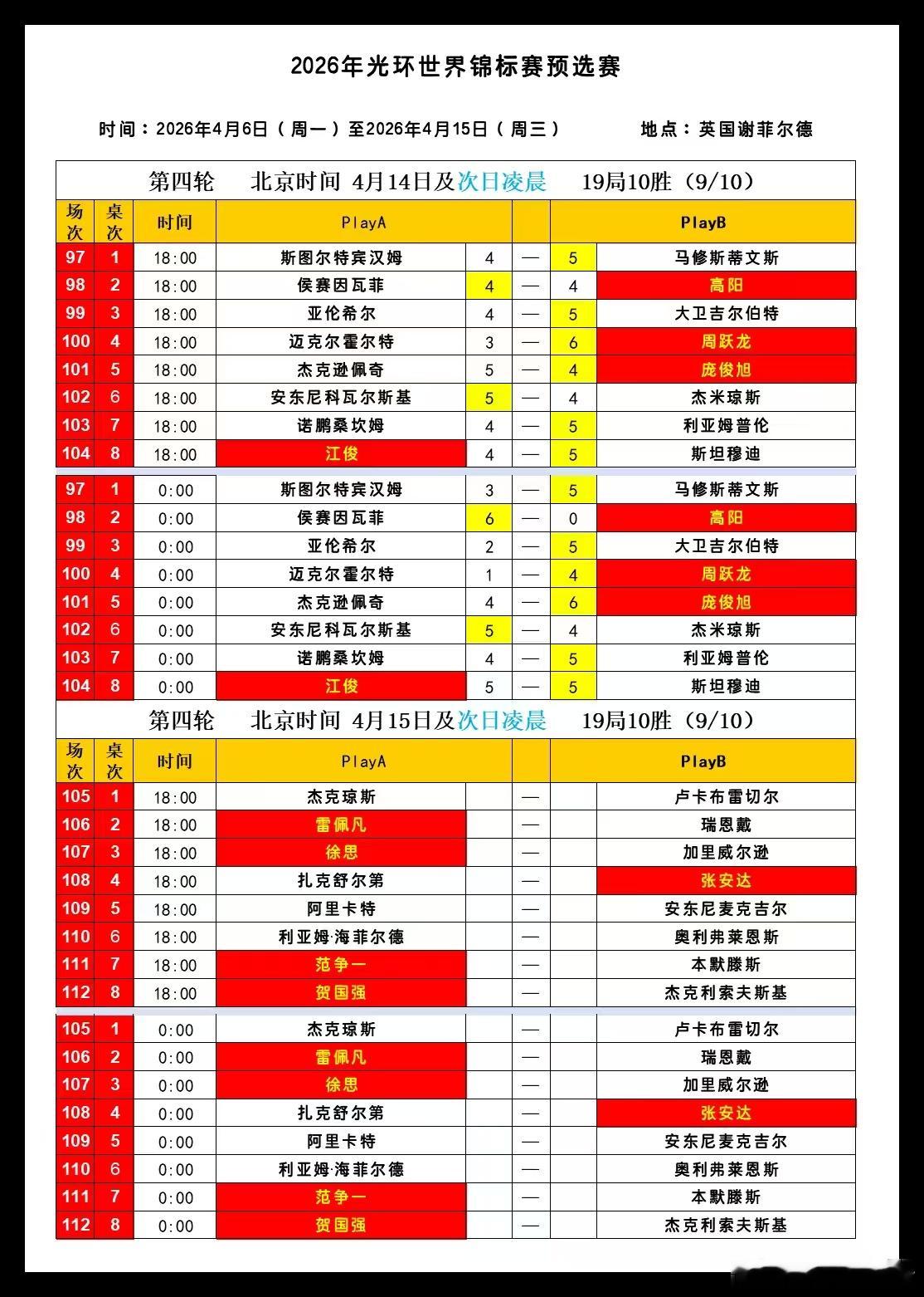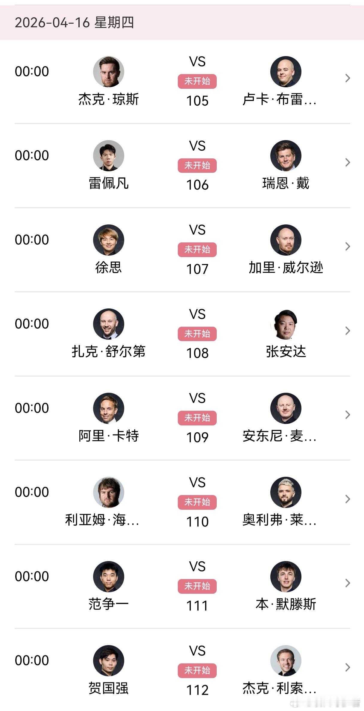 2026世界斯诺克世锦赛第六天 48进32(审判轮)中国选手周跃龙、庞俊旭两人率先晋级正赛拿到克鲁斯堡门票;高阳,江俊止步审判轮;2026.4.15日 星期三第三轮 48进32 19局10胜(9/10):18:00 直播: 范争一VS本默滕斯 第一阶段 小窗:张安达VS扎克舒尔迪 第一阶段2026.4.16日 星期四00:00 直播: 范争一VS本默滕斯 第二阶段 小窗:张安达VS扎克舒尔迪 第二阶段