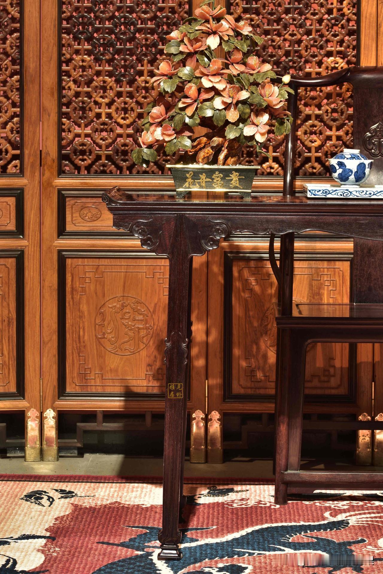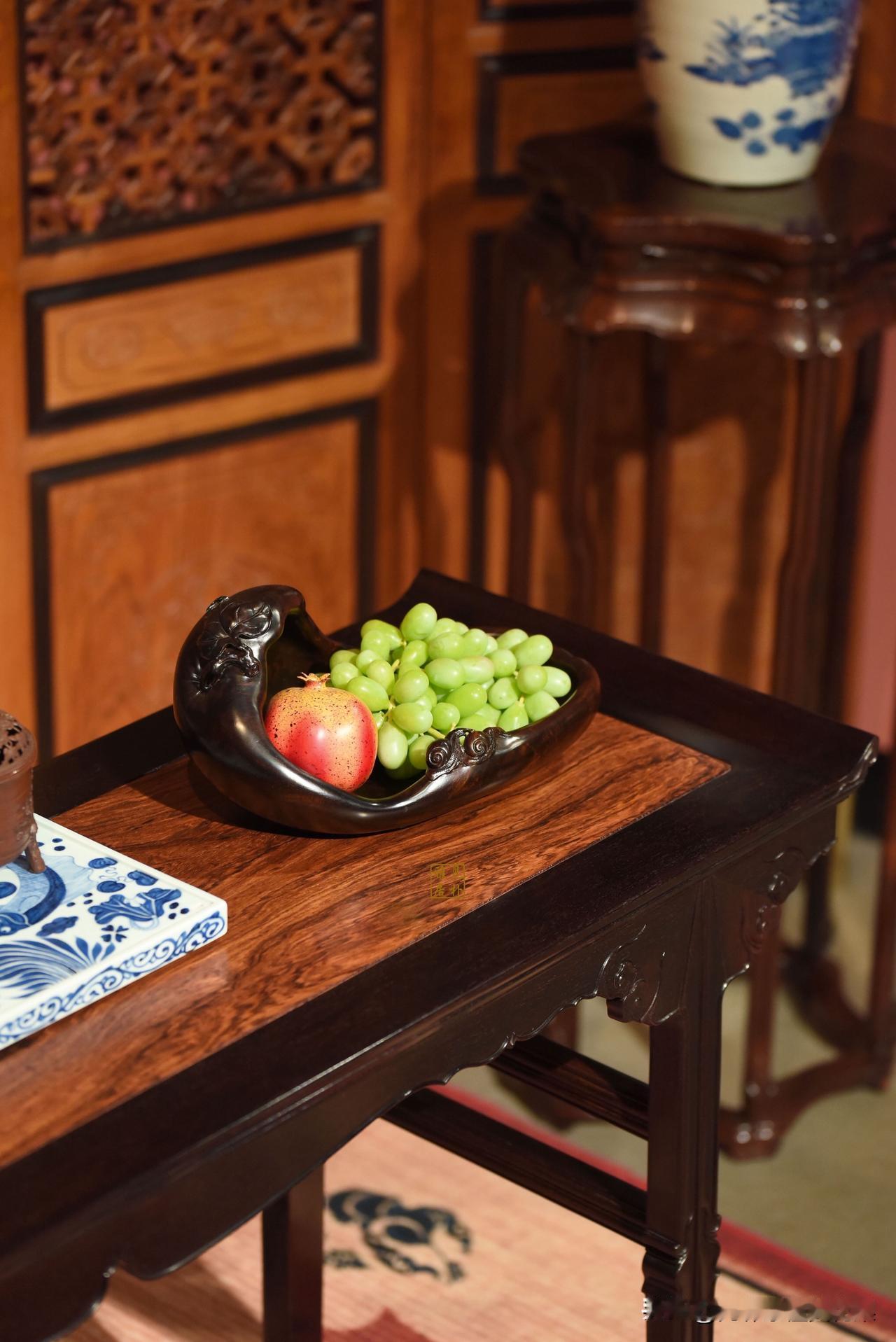 案雅何须大,花香不在多|紫檀镶海黄翘头案 一屏一几,一器一物,皆是东方美学的诗意栖居。 古雅的隔扇屏风,以榫卯藏巧,以木韵传情,为空间晕染出温润的中式底色。 酸枝木的案几,线条婉转如行云,纹理流转似山水,承托着青花的雅致、鲜果的鲜活,也安放着中式生活的闲情逸致。 黄花梨的面板,鬼眼纹天然成画,每一道木纹都是时光镌刻的诗意,每一寸肌理都藏着木作的匠心。 案头的玉雕花树,花开富贵,生机盎然;果盘里的石榴葡萄,寓意多子多福,圆满顺遂。 一屋雅器,满室清欢,于方寸之间,见东方千年的雅致与风骨。