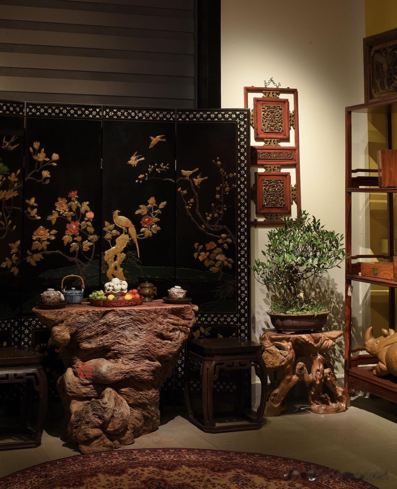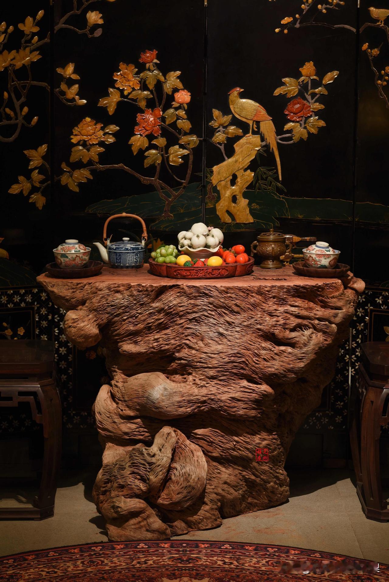 南方最神奇的木纹,无需雕刻,已成艺术! 龙眼木花架茶几 这套茶台为天然随形根雕茶台,以整根古木随形打磨而成,保留了树木天然的纹理与形态,无拼接、无修饰,是中式茶空间的经典陈设: 核心特色:天然随形、纹理独特、结构稳固,每一件都是孤品,兼具实用与收藏价值 空间搭配:搭配大漆描金花鸟屏风、中式茶器与盆景,完美还原了传统文人茶室的雅致氛围,适配高端家居、茶空间展示等场景。