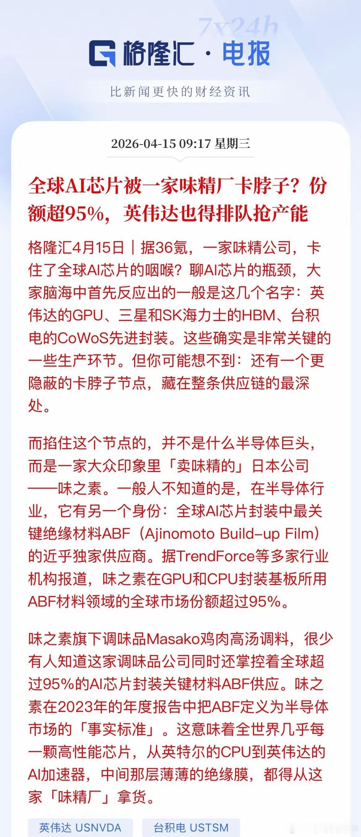 全球AI芯片被“味精厂”卡脖子!份额超95%,A股国产替代机会来了?你敢信?全球最火热的AI芯片,居然被一家“卖味精”的公司掐住了命门。味之素——这家你大概率在超市调料区见过的日本公司,除了生产“Masako”鸡精,还干了一件匪夷所思的事:它垄断了全球95%以上的AI芯片封装关键材料——ABF。它有多重要?从英伟达的H100、AMD的MI300,到英特尔的CPU,几乎每一颗高端芯片的封装,都离不开味之素的ABF膜,英伟达也得排队抢产能,台积电得看脸色!ABF:直译过来就是“味之素堆积膜”。是高端CPU/GPU封装基板的核心绝缘材料,直接决定芯片的信号传输效率、散热性能和良率,是Chiplet、CoWoS先进封装的刚需材料。随着AI算力需求爆发,ABF产能持续吃紧,已成为全球AI芯片产业链最隐蔽、却也最核心的瓶颈之一。95%的全球市占率,意味着全球AI芯片生产都被这家“味精厂”拿捏,而味之素扩产谨慎、产能有限,国产替代已成必然趋势。A股相关产业链迎来历史性机遇:1.核心材料端ABF薄膜国产替代最直接受益。·华正新材:国内ABF材料龙头,已实现量产并通过头部封测厂验证。·生益科技:国内覆铜板龙头,持续研发ABF类高端封装基板材料,技术储备深厚,已实现小批量供货。·南亚新材:高端封装基板材料布局领先,ABF相关产品已进入客户验证阶段。·金安国纪:布局高端封装基板用ABF树脂材料,研发进度领先,已完成中试,即将进入量产阶段。2.封装基板/封测端用ABF膜做封装基板的公司,国产替代直接降低采购成本、保障供应链安全。·深南电路:国内高端封装基板龙头,ABF基板量产能力领先,深度绑定国内AI芯片厂商。·沪电股份:高端PCB/封装基板核心企业,ABF基板产品已应用于AI服务器、GPU封装。·兴森科技:国内封装基板龙头,ABF基板产能持续扩张,切入英伟达、AMD供应链。·长电科技/通富微电/华天科技:国内封测三巨头,是ABF材料的核心下游客户,ABF国产替代将直接降低封测成本。3.上游树脂/设备端没有原料和设备,ABF国产化就是空话,它们是这条产业链的地基。·万华化学:国内化工龙头,掌握ABF核心原料环氧树脂的自主生产技术,为ABF材料国产化提供原料保障。·新宙邦:高端电子化学品龙头,为ABF材料生产提供配套化学品。·精测电子/芯碁微装:国内半导体设备龙头,为ABF材料、封装基板生产提供检测、光刻设备。